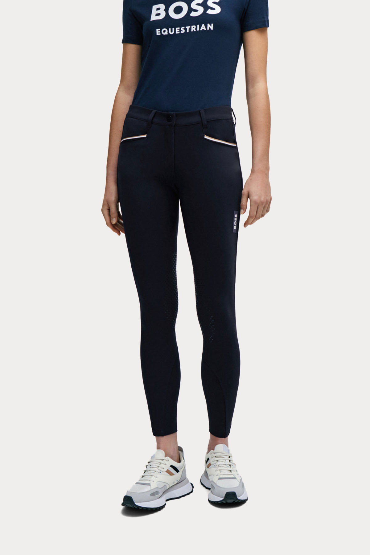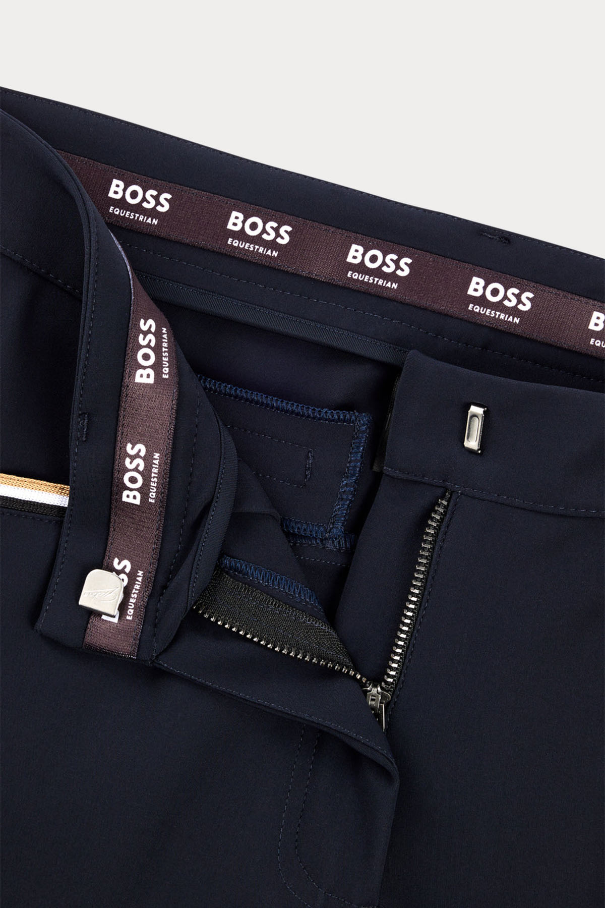 Diese Reithose mit schmeichelndem, mittelhohem Bund wird mit einem Reißverschluss und einem Hakenverschluss geschlossen und präsentiert stolz das BOSS-Logo. Die schmalen Jersey-Einsätze am Beinabschluss sorgen für einen geschmeidigen Sitz unter Ihren Reitstiefeln, während stilvolle Details wie das BOSS Signature Stripe Tape und der marineblaue Silikon-Logo-Patch am Oberschenkel für einen Hauch von Raffinesse sorgen.
