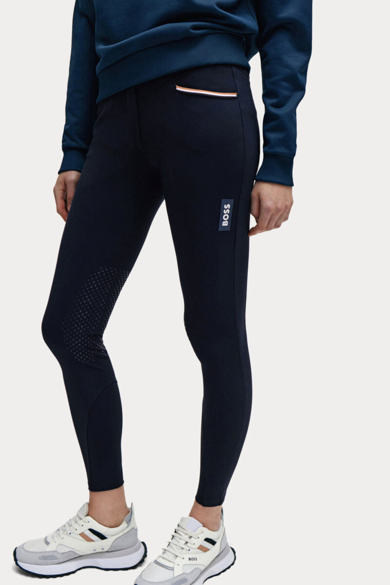 Diese Reithose mit schmeichelndem, mittelhohem Bund wird mit einem Reißverschluss und einem Hakenverschluss geschlossen und präsentiert stolz das BOSS-Logo. Die schmalen Jersey-Einsätze am Beinabschluss sorgen für einen geschmeidigen Sitz unter Ihren Reitstiefeln, während stilvolle Details wie das BOSS Signature Stripe Tape und der marineblaue Silikon-Logo-Patch am Oberschenkel für einen Hauch von Raffinesse sorgen.