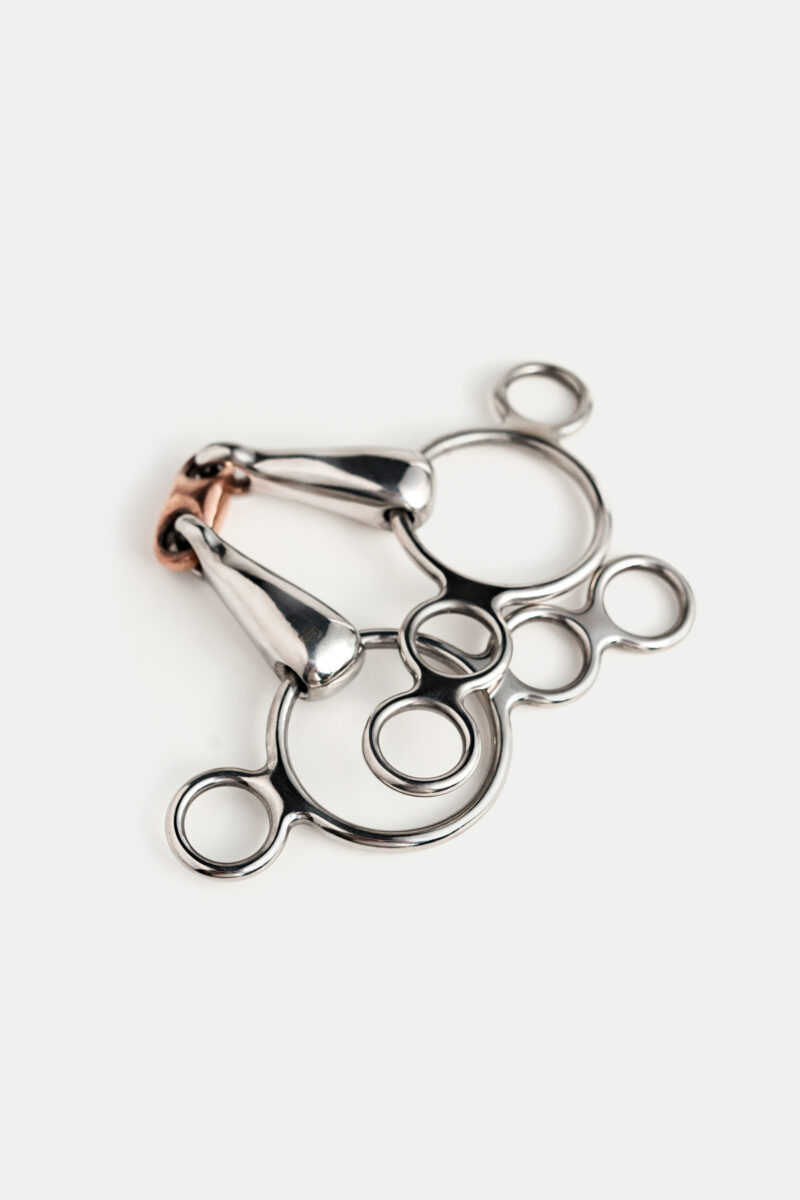 Dit bit heeft drie ringen, waarbij de bovenste ring aan de bakstukken van het hoofdstel wordt bevestigd en de teugels aan een van de drie onderste ringen, wat verschillende hefboomwerkingen biedt. Het is vooral handig voor sterke paarden, omdat de onderste ringen een hefboomeffect creëren wanneer het paard op het bit leunt. Ook wel bekend als een continentaal bit, brengt het het bit in de mond van het paard omhoog op dezelfde manier als een traditionele ophaaltrens, maar dan minder hard. Bij gebruik van de teugels op de onderste ringen is er een aanzienlijke toename van de druk op de nek. Om dit te voorkomen, raden we aan om twee teugels te gebruiken of rondingen aan één teugel te bevestigen. Deze aanpak helpt om goed contact met de trensring te behouden zonder dat er druk op de nek wordt uitgeoefend wanneer dat niet gewenst is.