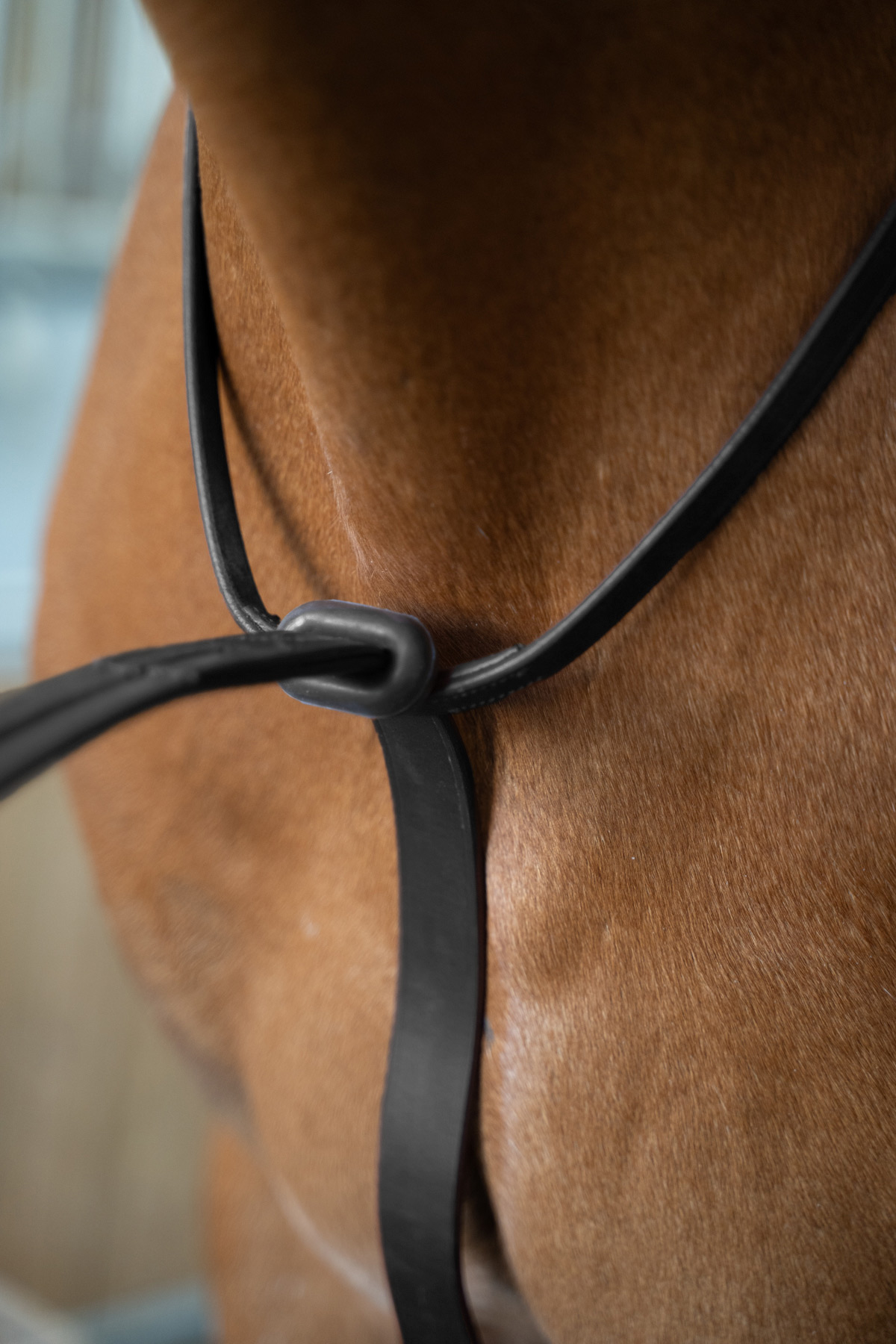 Met duurzame messing gespen en een strak leren ontwerp combineert deze martingaal stevigheid met elegantie, waardoor het een betrouwbare en stijlvolle keuze is voor professionele ruiters. De leren constructie biedt niet alleen duurzaamheid, maar verbetert ook het comfort, waardoor uw paard vrij kan bewegen en tegelijkertijd consistente controle behoudt.