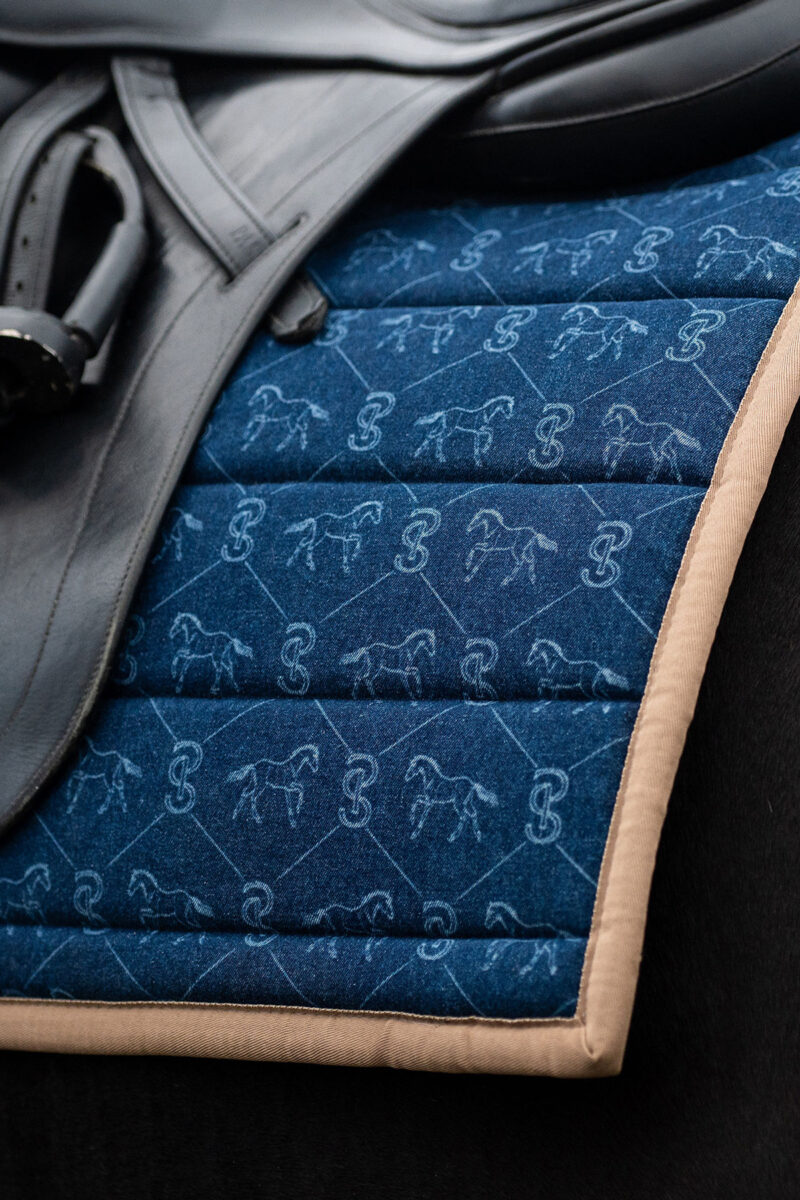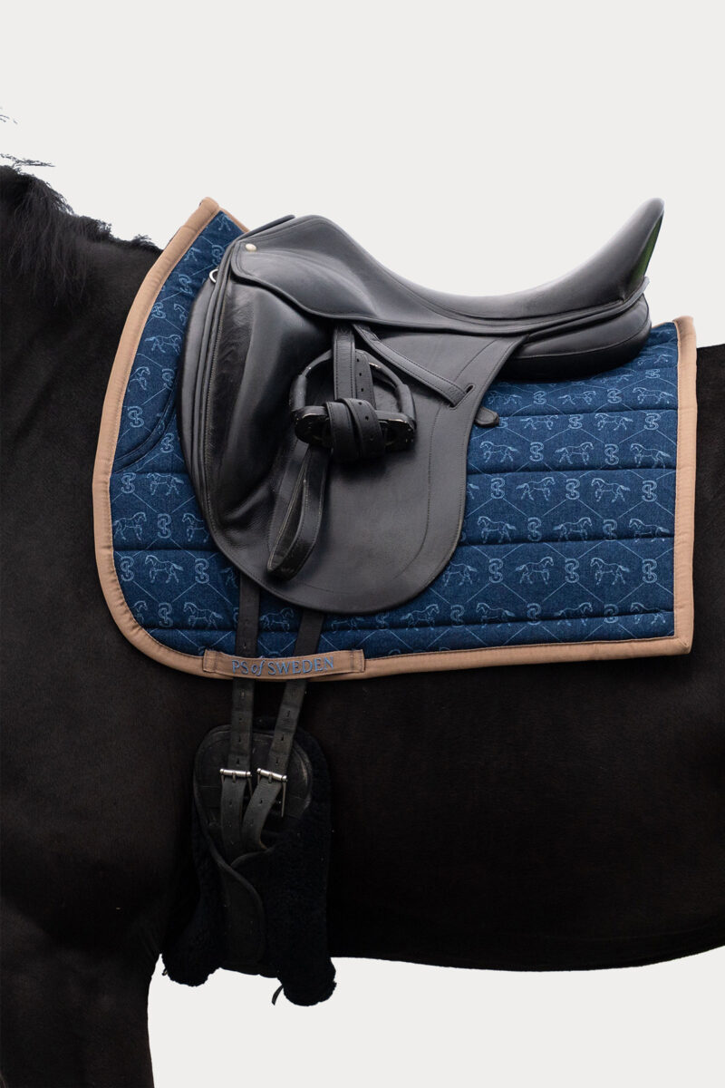 Geef je rijuitrusting een upgrade met het PS of Sweden Running Horse zadeldek in denim. Dit zadeldek in beperkte oplage heeft een levendige print van een rennend paard op een duurzame denim basis, waardoor het een stijlvolle keuze is voor elke ruiter.