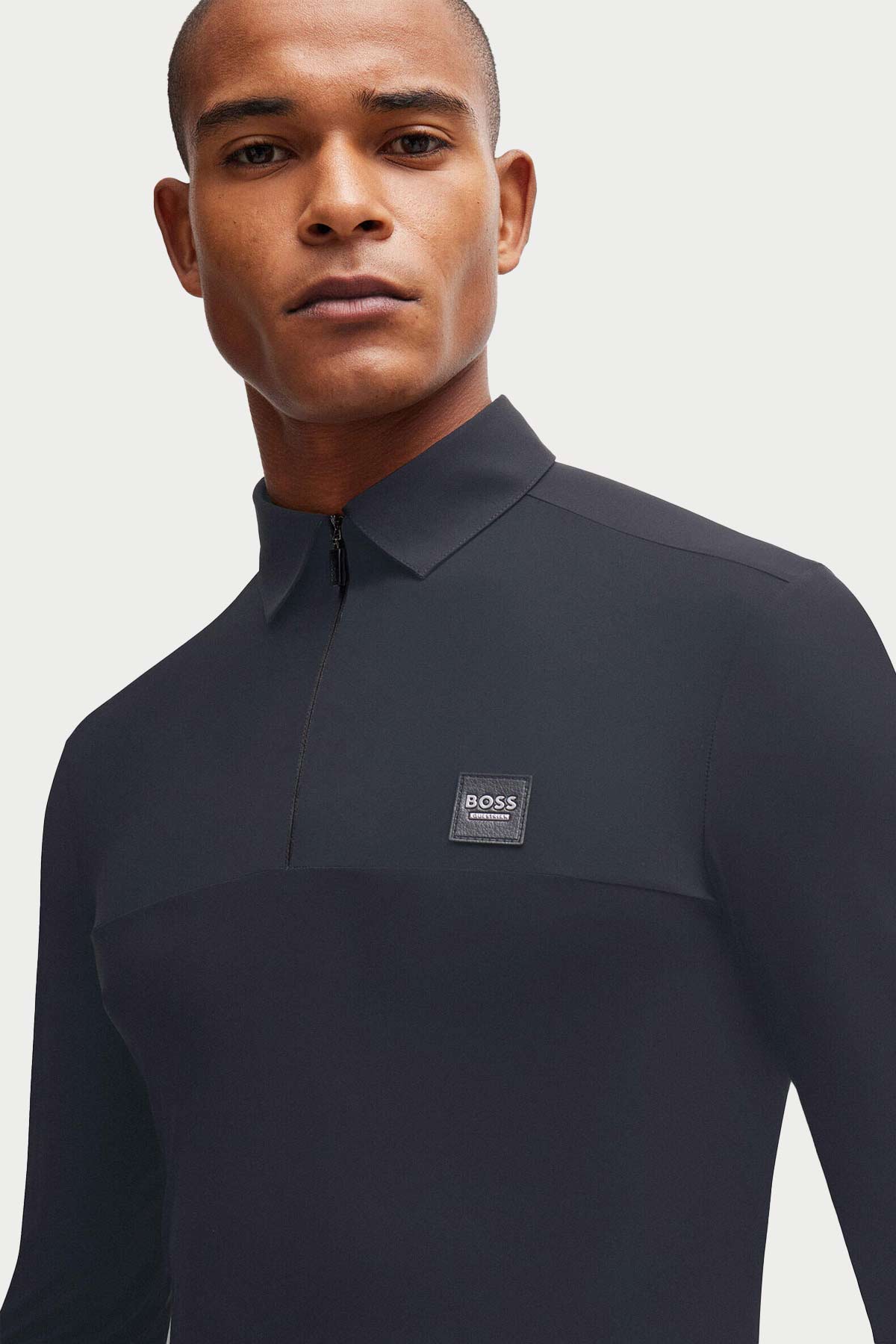 The shirt features a narrow zipped placket with a signature stripe, adding a stylish, athletic touch. The BOSS logo patch in synthetic-coated fabric, resembling faux leather, brings a contemporary edge to this high-performance piece. Designed to offer maximum flexibility, the Elton Training Shirt moves with you, allowing for a full range of motion as you focus on your ride.
