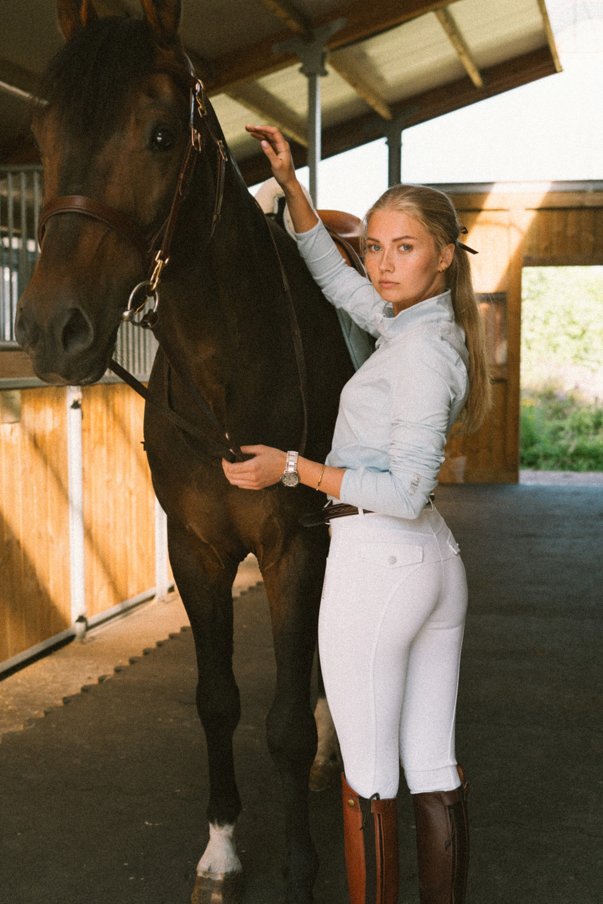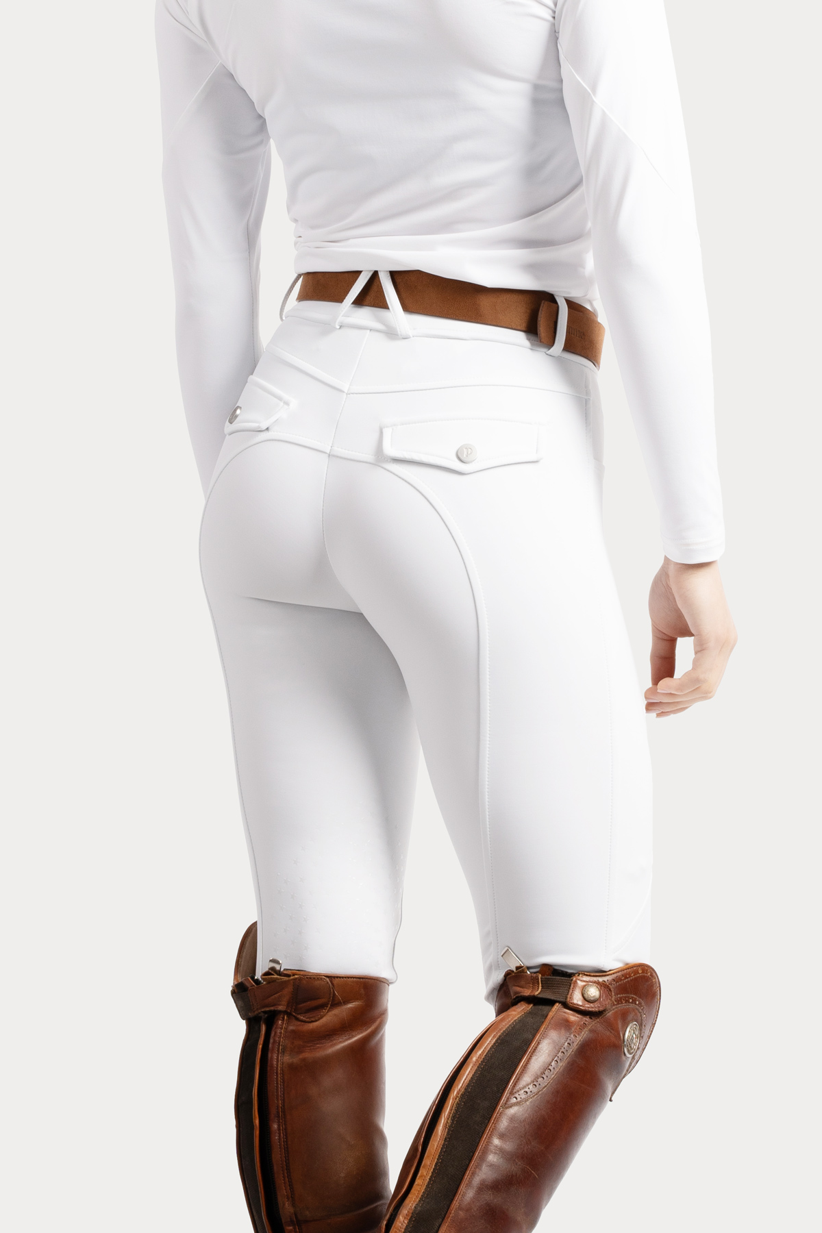De Pomme Fay rijbroek heeft twee zakken aan de voorkant, perfect voor je mobiele telefoon of kleine spullen, en neppe klepzakken aan de achterkant voor extra stijl. Zonder rits of knopen aan de voorkant biedt de broek een naadloze look, waardoor je het beste van zowel een panty als een traditionele rijbroek krijgt.