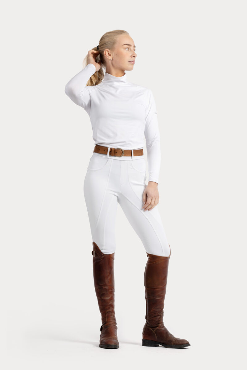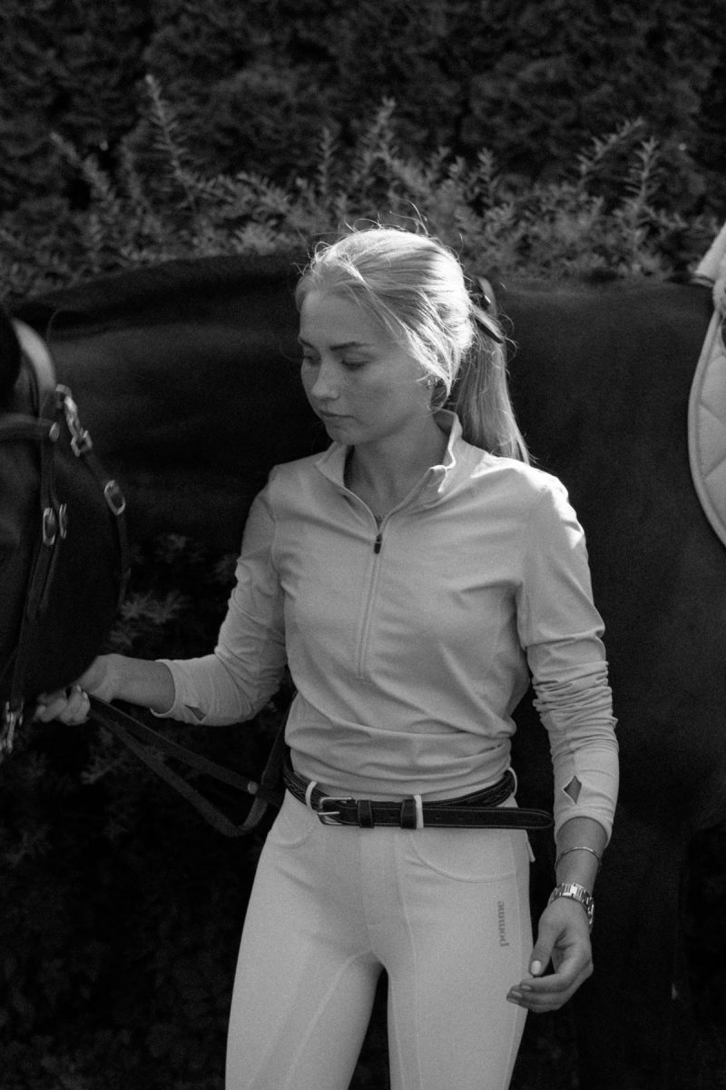 De Pomme Fay rijbroek heeft twee zakken aan de voorkant, perfect voor je mobiele telefoon of kleine spullen, en neppe klepzakken aan de achterkant voor extra stijl. Zonder rits of knopen aan de voorkant biedt de broek een naadloze look, waardoor je het beste van zowel een panty als een traditionele rijbroek krijgt.
