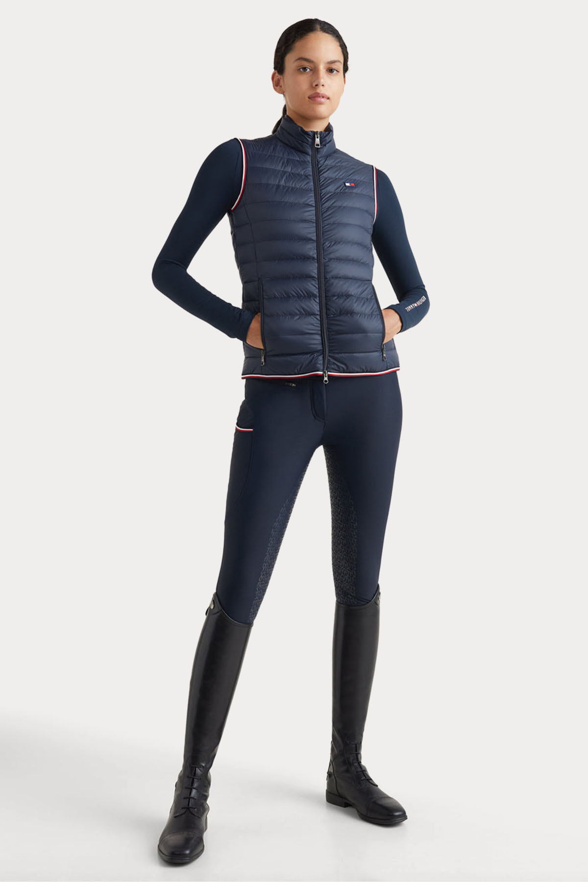 Blijf warm en stijlvol met het Tommy Hilfiger Women Light Re-Down vest, een perfect laagjesitem voor koude dagen. Gevuld met milieuvriendelijk 100% gerecycled dons en veren, combineert het comfort met duurzaamheid. Het waterafstotende buitenmateriaal zorgt ervoor dat je droog blijft, terwijl de elastische armsgaten en zoom, afgewerkt met Tommy's iconische kleuren, een sportieve touch toevoegen. Met een tweewegrits voor optimaal draagcomfort en twee ritszakken voor extra gemak. Afgewerkt met een siliconen logobadge op de borst en GRS-certificering, is dit vest even ethisch als praktisch. Jouw go-to voor zowel paardrijden als dagelijkse avonturen.