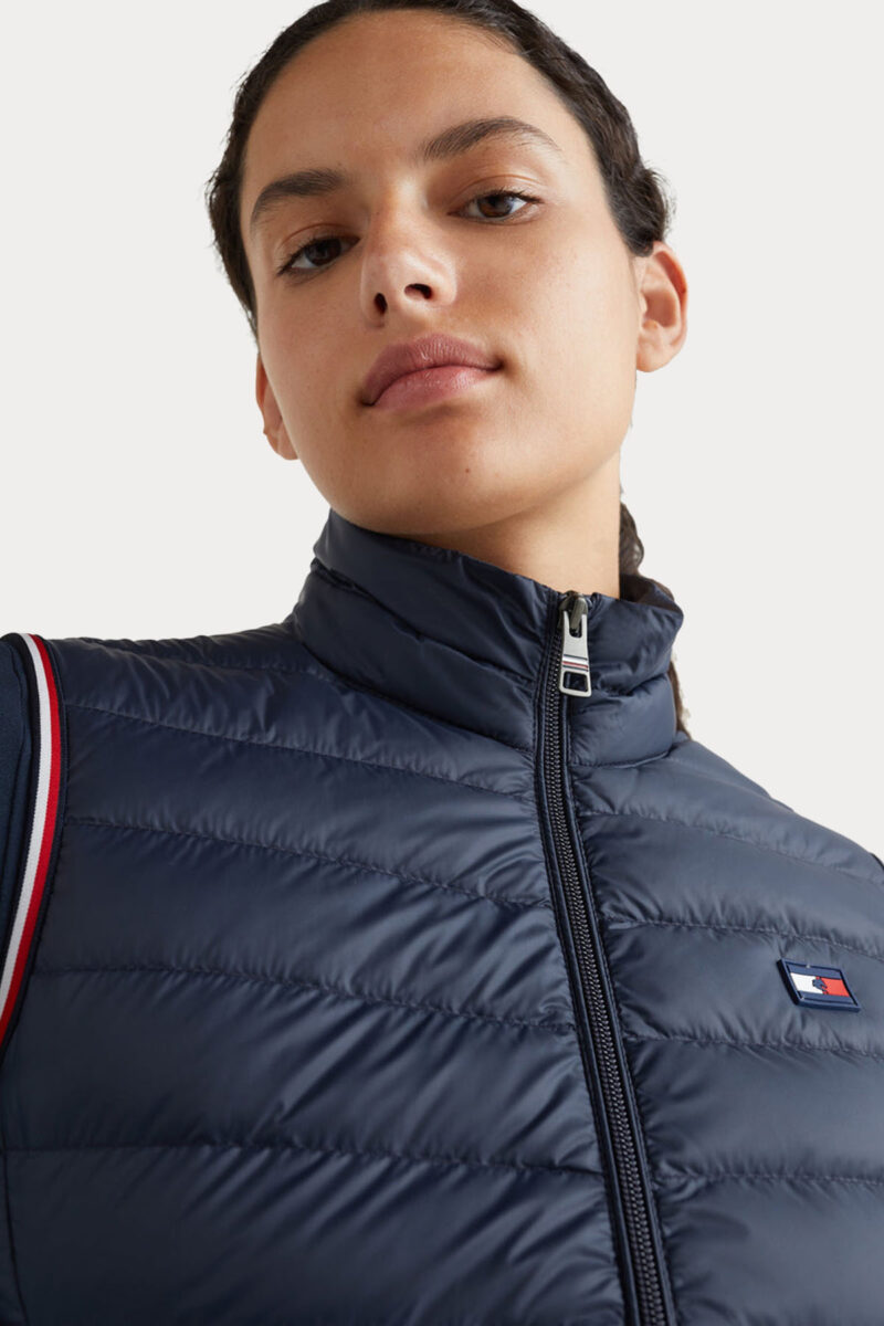 Blijf warm en stijlvol met het Tommy Hilfiger Women Light Re-Down vest, een perfect laagjesitem voor koude dagen. Gevuld met milieuvriendelijk 100% gerecycled dons en veren, combineert het comfort met duurzaamheid. Het waterafstotende buitenmateriaal zorgt ervoor dat je droog blijft, terwijl de elastische armsgaten en zoom, afgewerkt met Tommy's iconische kleuren, een sportieve touch toevoegen. Met een tweewegrits voor optimaal draagcomfort en twee ritszakken voor extra gemak. Afgewerkt met een siliconen logobadge op de borst en GRS-certificering, is dit vest even ethisch als praktisch. Jouw go-to voor zowel paardrijden als dagelijkse avonturen.