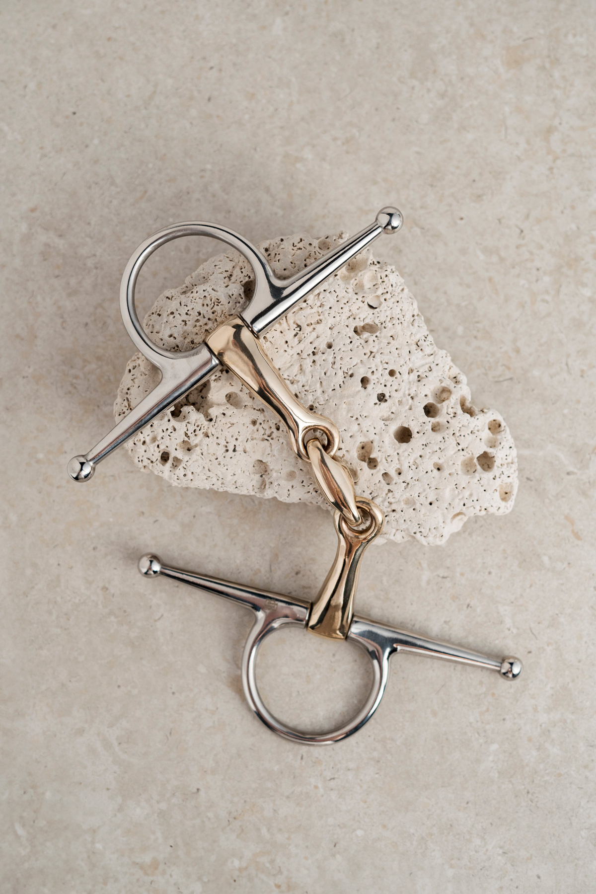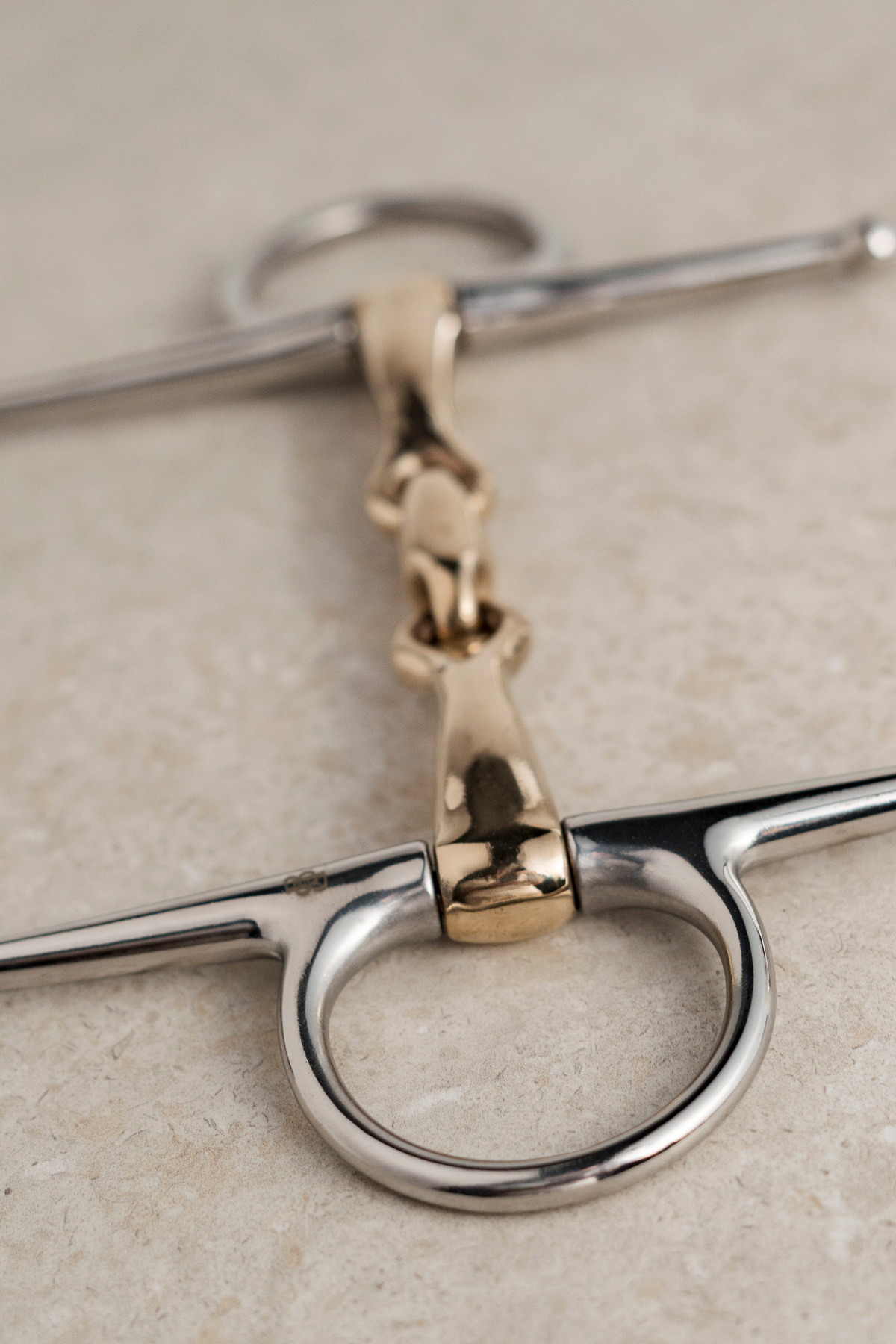 Brass alloy is created by blending copper with a harder metal, resulting in a warm and durable material ideal for horse bits. It can promote salivation and be more pleasant to the horse.