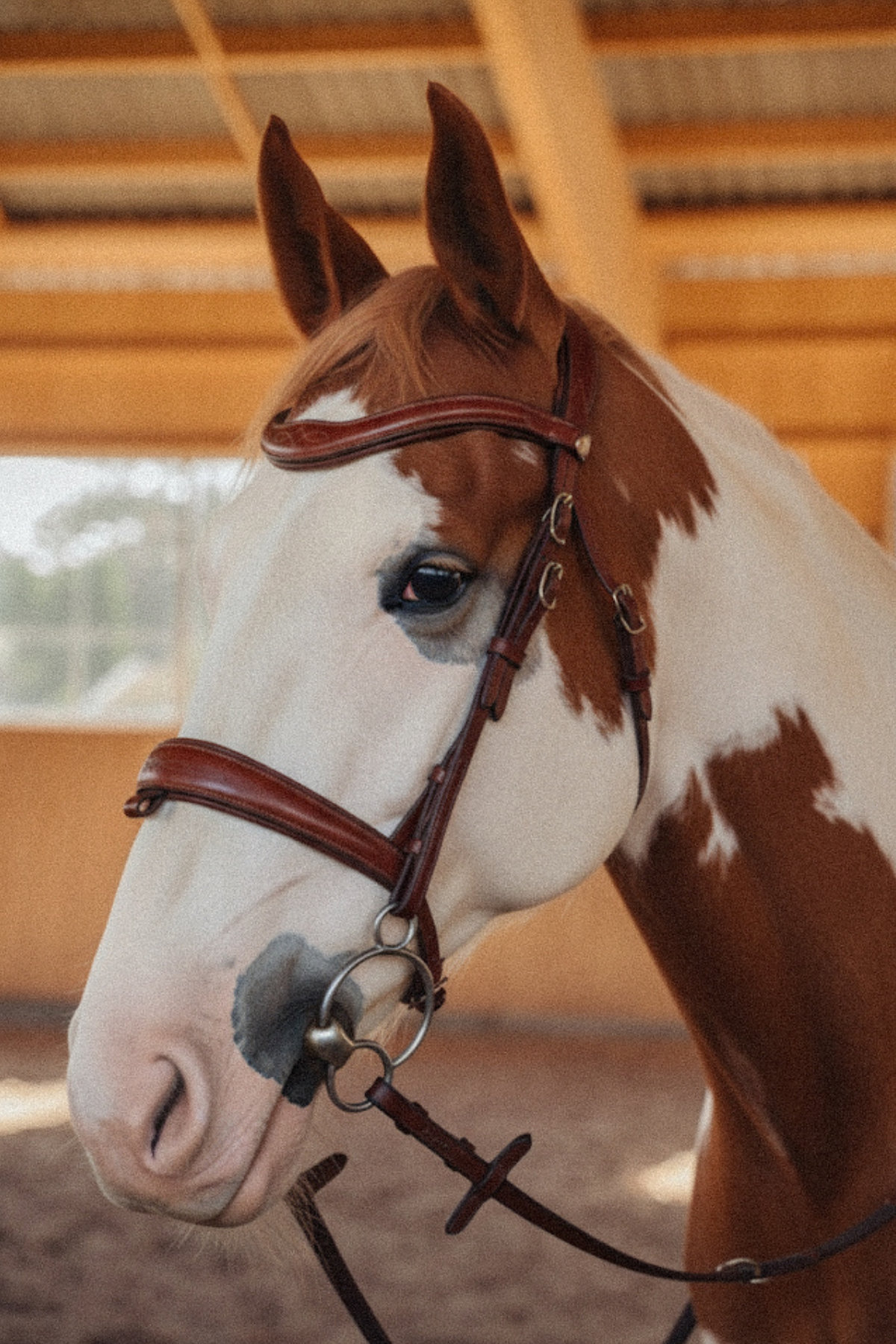 Adding a touch of timeless elegance, the bridle features brass buckles that elevate its design. Crafted entirely from 100% quality leather, it ensures both quality and durability, promising a lasting connection with your horse. The set includes woven reins.