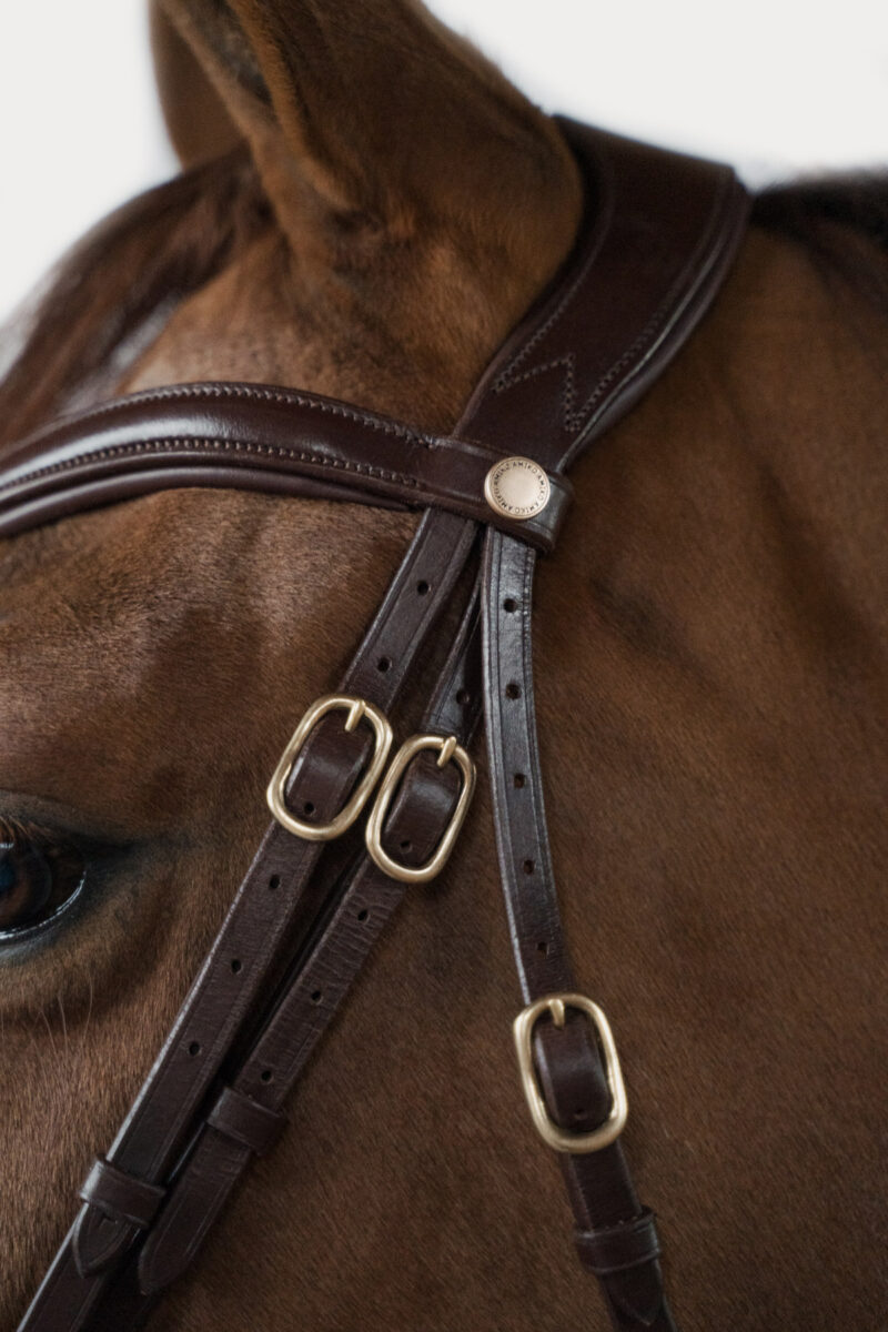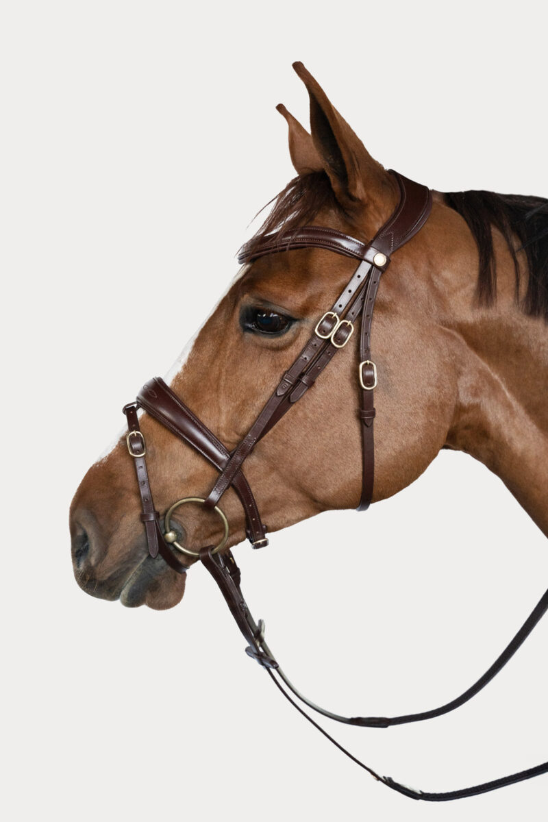 Adding a touch of timeless elegance, the bridle features brass buckles that elevate its design. Crafted entirely from 100% quality leather, it ensures both quality and durability, promising a lasting connection with your horse. The set includes woven reins.