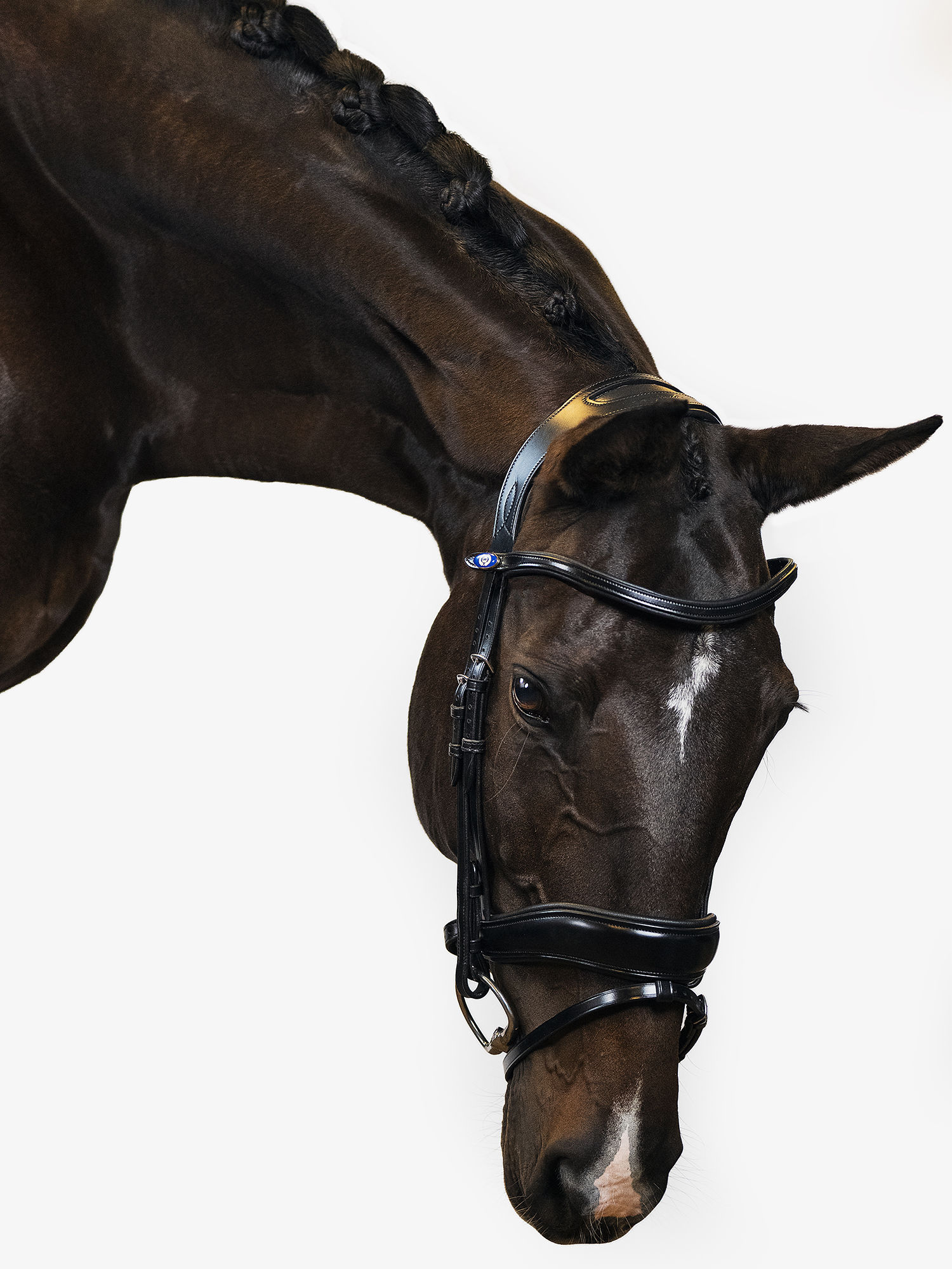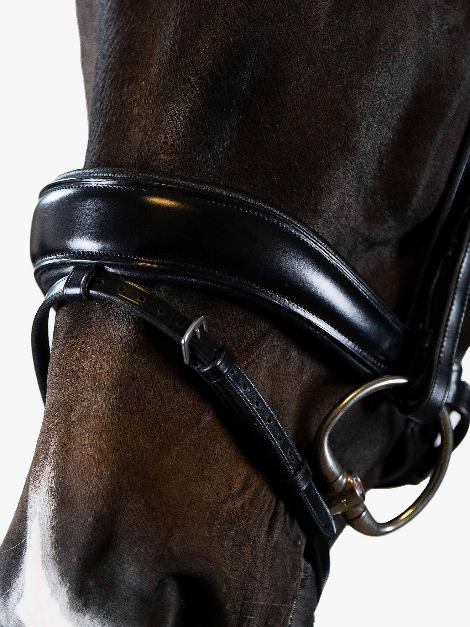 The headpiece is designed with the horse’s anatomy in mind. Its extra-wide profile and top cut-out help distribute pressure evenly over the poll, avoiding concentrated tension points. Shaped to allow full ear freedom, it ensures a comfortable and unobtrusive fit for even the most sensitive horses.