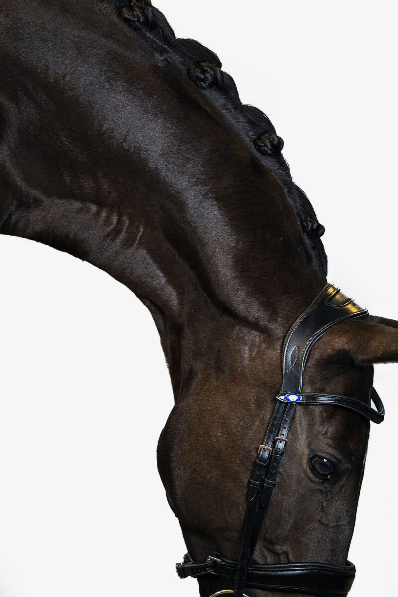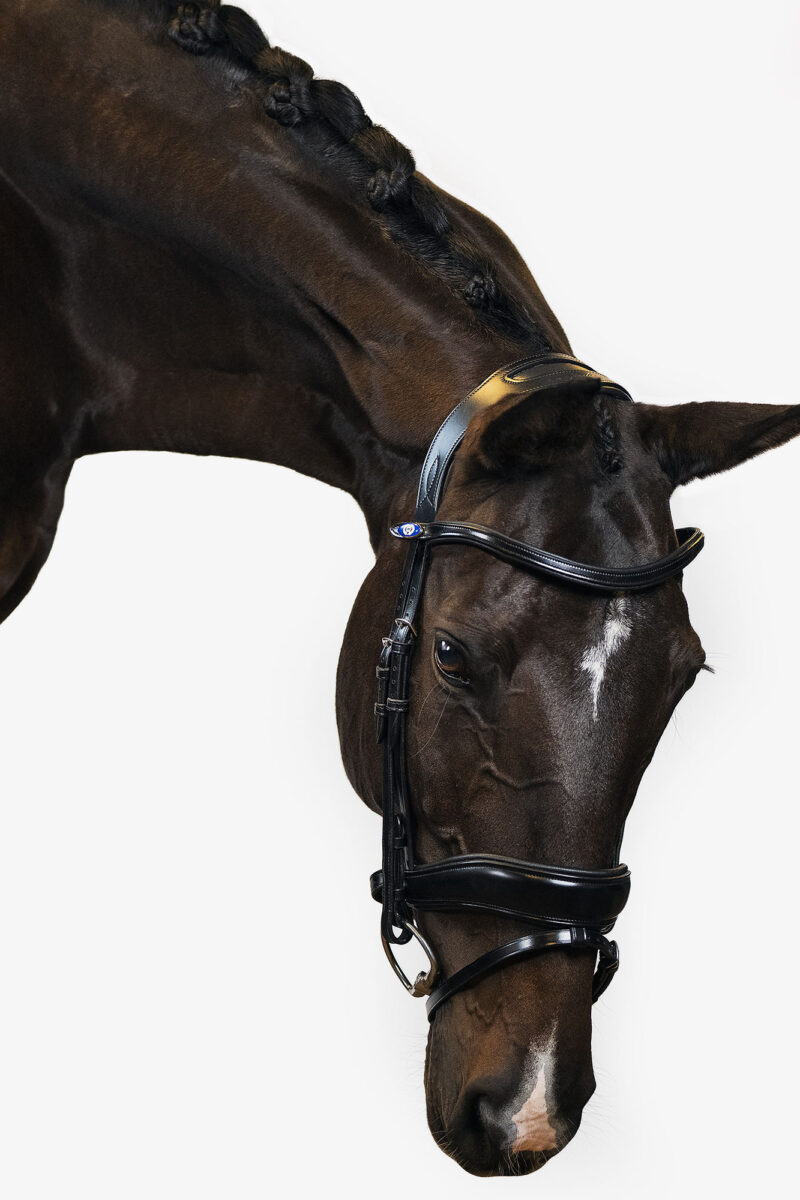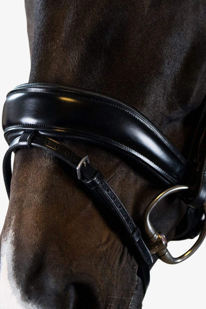 The headpiece is designed with the horse’s anatomy in mind. Its extra-wide profile and top cut-out help distribute pressure evenly over the poll, avoiding concentrated tension points. Shaped to allow full ear freedom, it ensures a comfortable and unobtrusive fit for even the most sensitive horses.