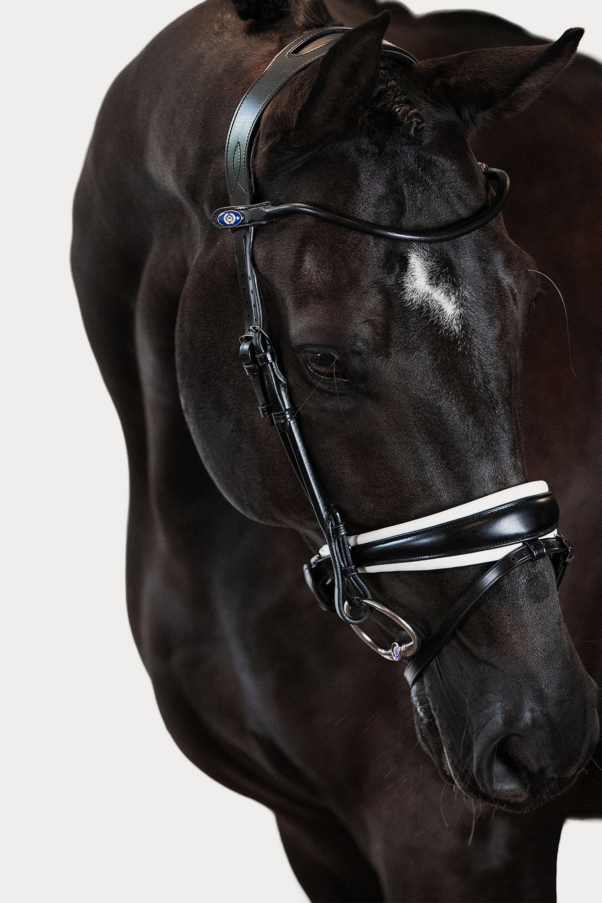 - Noseband: Crafted with extra soft padding and a unique drop shape, the noseband is wider in the middle (5.5 cm) and tapers on the sides. This design, along with the padded plate under the chin, makes it ideal for horses with sensitive jaws and cheekbones, as well as those accustomed to traditional English nosebands.