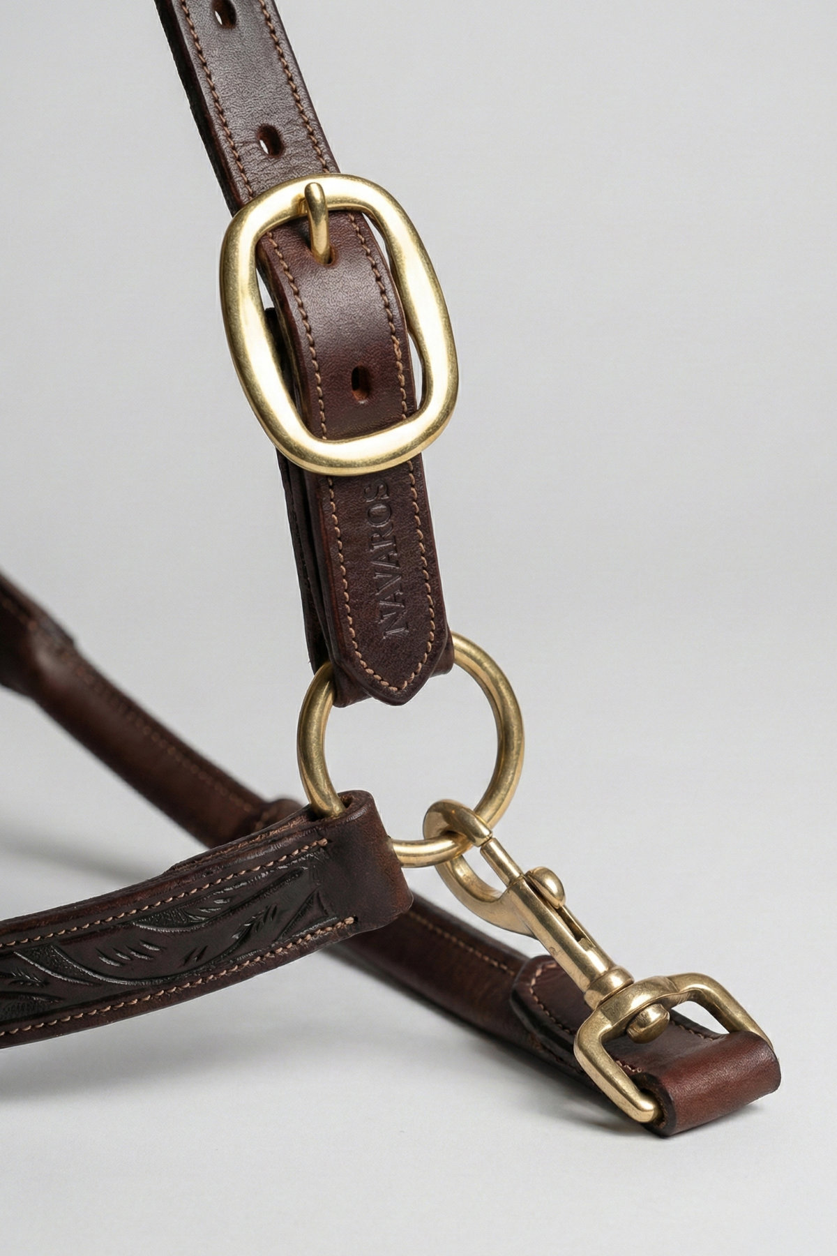 Crafted in rich Havana Brown leather, the halter features broad nose and cheek straps that provide enhanced stability and balanced pressure distribution. The wider leather surfaces also highlight the craftsmanship and allow the design to stand out with understated elegance. Finished with solid brass buckles, it ensures secure adjustment while adding warmth and longevity to the overall construction.