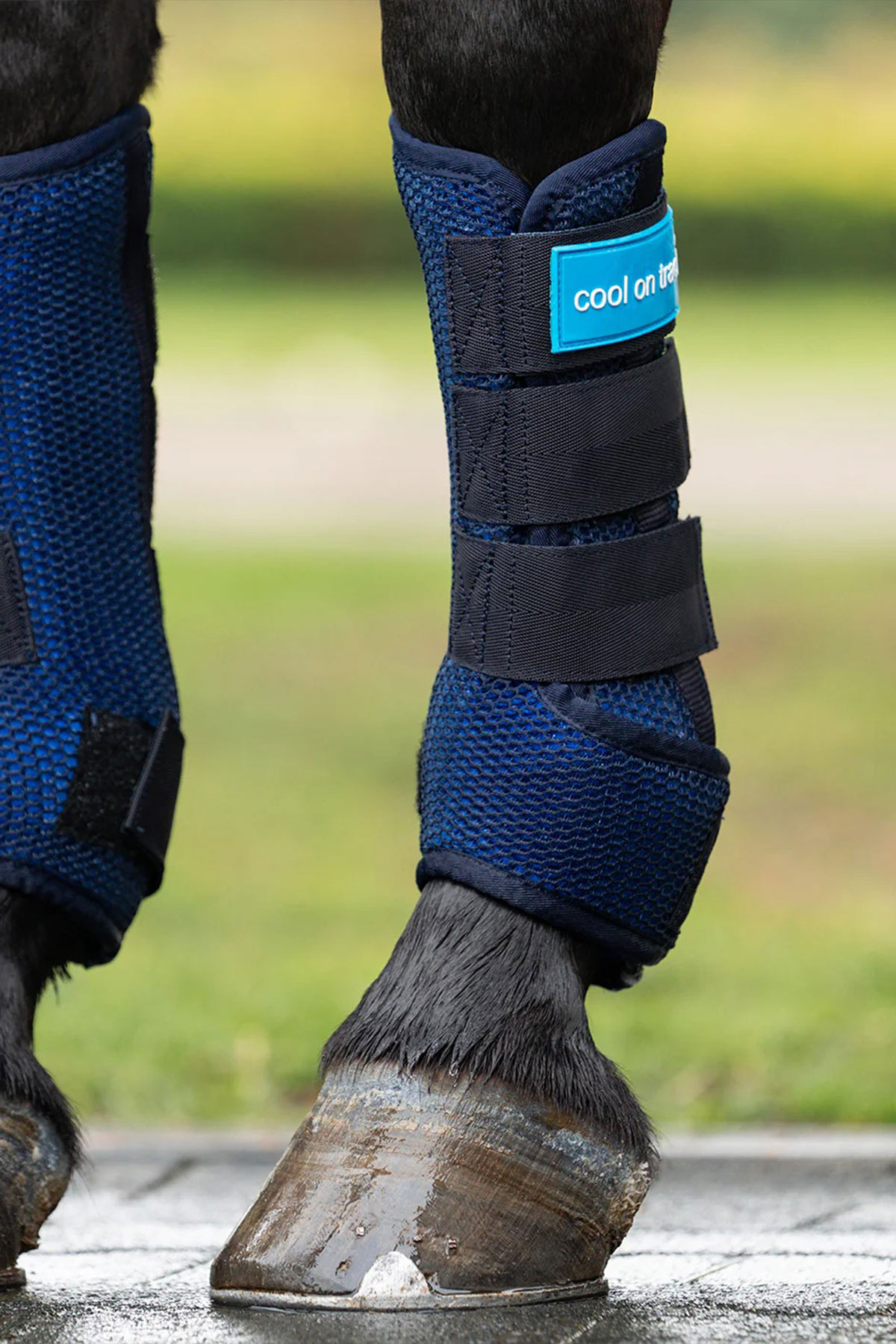 The outer shell features a robust mesh material that allows efficient airflow and promotes the evaporative cooling process. Inside, the technical Cool On Trackâ„¢ material—made from PVA and cotton—retains moisture just long enough to deliver an effective cooling cycle without the need for a freezer. Wide Velcro straps provide a secure, adjustable fit, while the quick-wrap design ensures ease of application whether you’re at the stable or at a show.