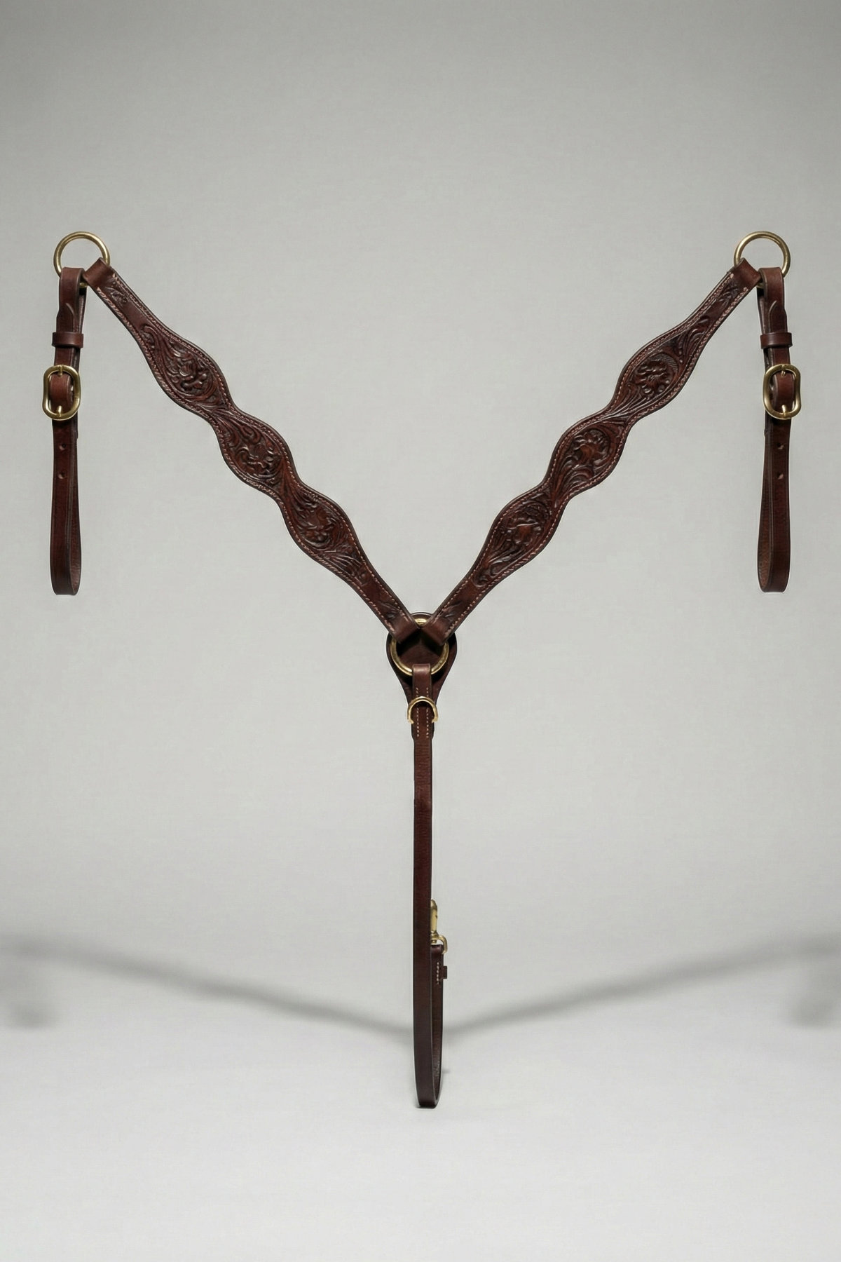 The anatomical, wave-cut side pieces follow the natural lines of the horse’s shoulder, reducing pressure and enhancing comfort during work. Two angled side straps meet in a central ring, distributing tension evenly, while the lower girth strap provides added stability and balance. Crafted in rich Havana Brown leather and finished with solid brass buckles, this breast collar is highly adjustable to ensure a precise, tailored fit.