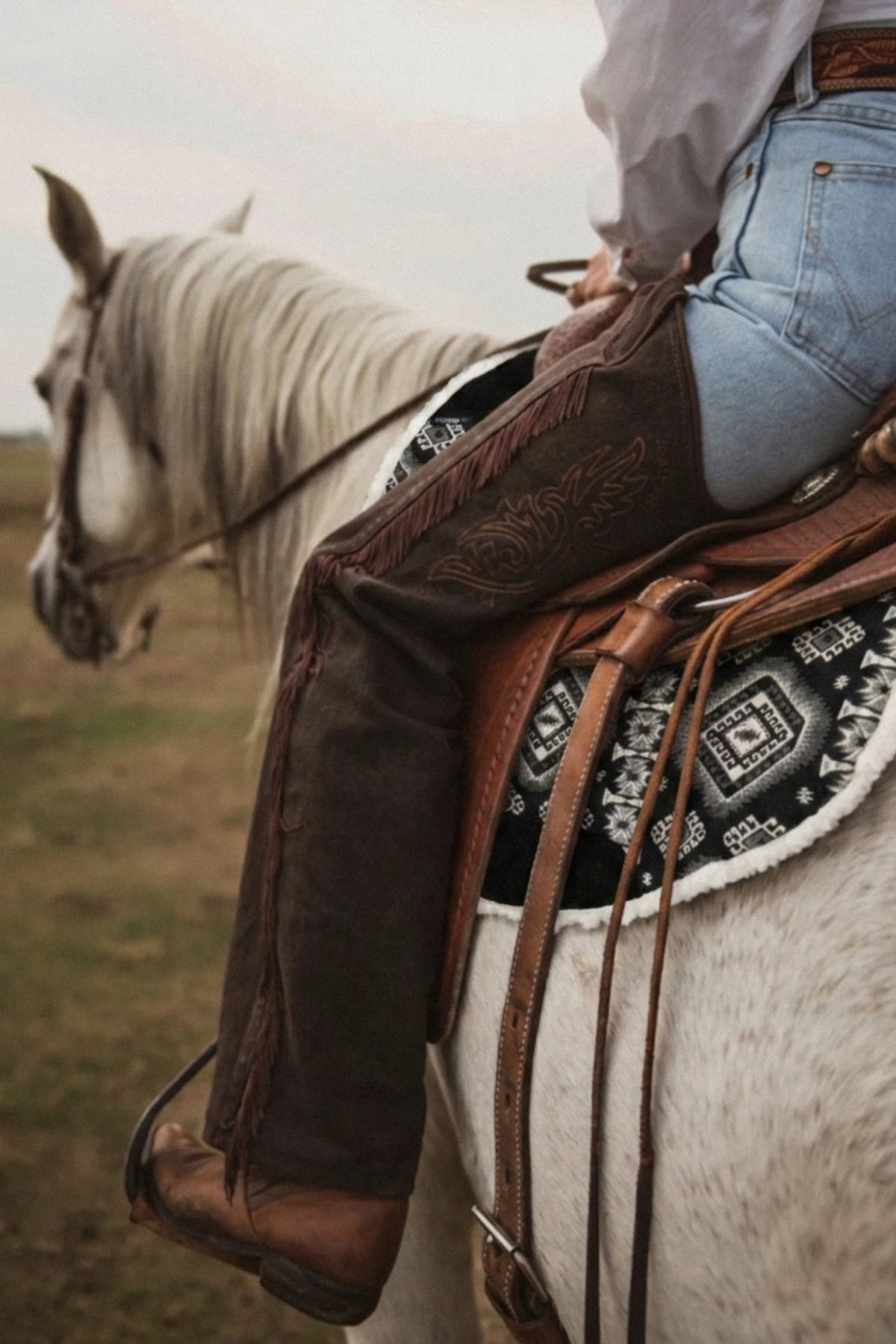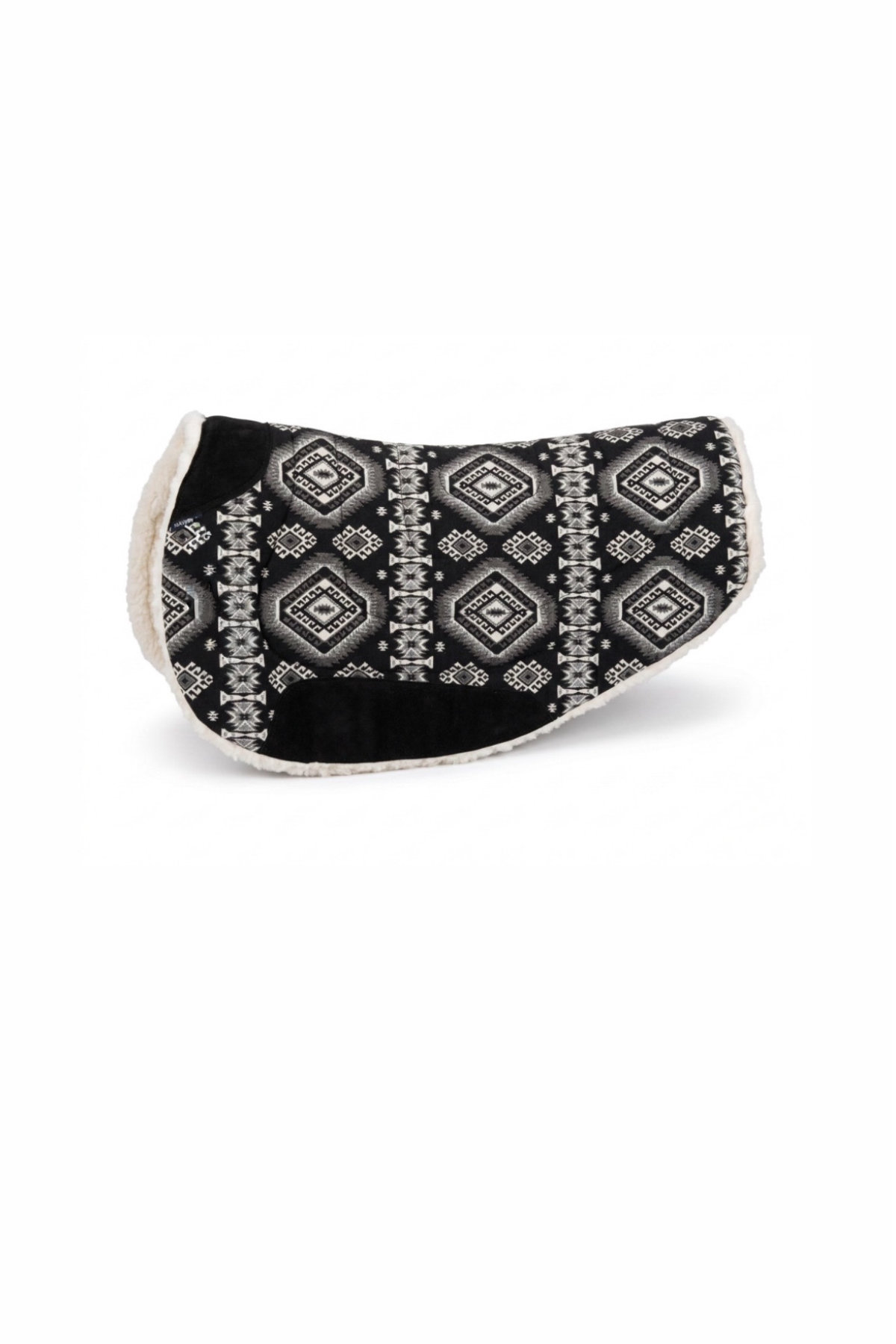 The distinctive geometric pattern in deep black and crisp white is framed with a clean white border, creating a sharp contrast that complements every horse beautifully. Beneath its elegant surface, a thick and soft synthetic fleece lining provides excellent moisture-wicking properties while evenly distributing pressure from the saddle, supporting the horse’s comfort throughout longer rides. Thoughtfully placed soft yet durable leather reinforcements protect high-wear areas, ensuring long-lasting performance without compromising flexibility or feel.