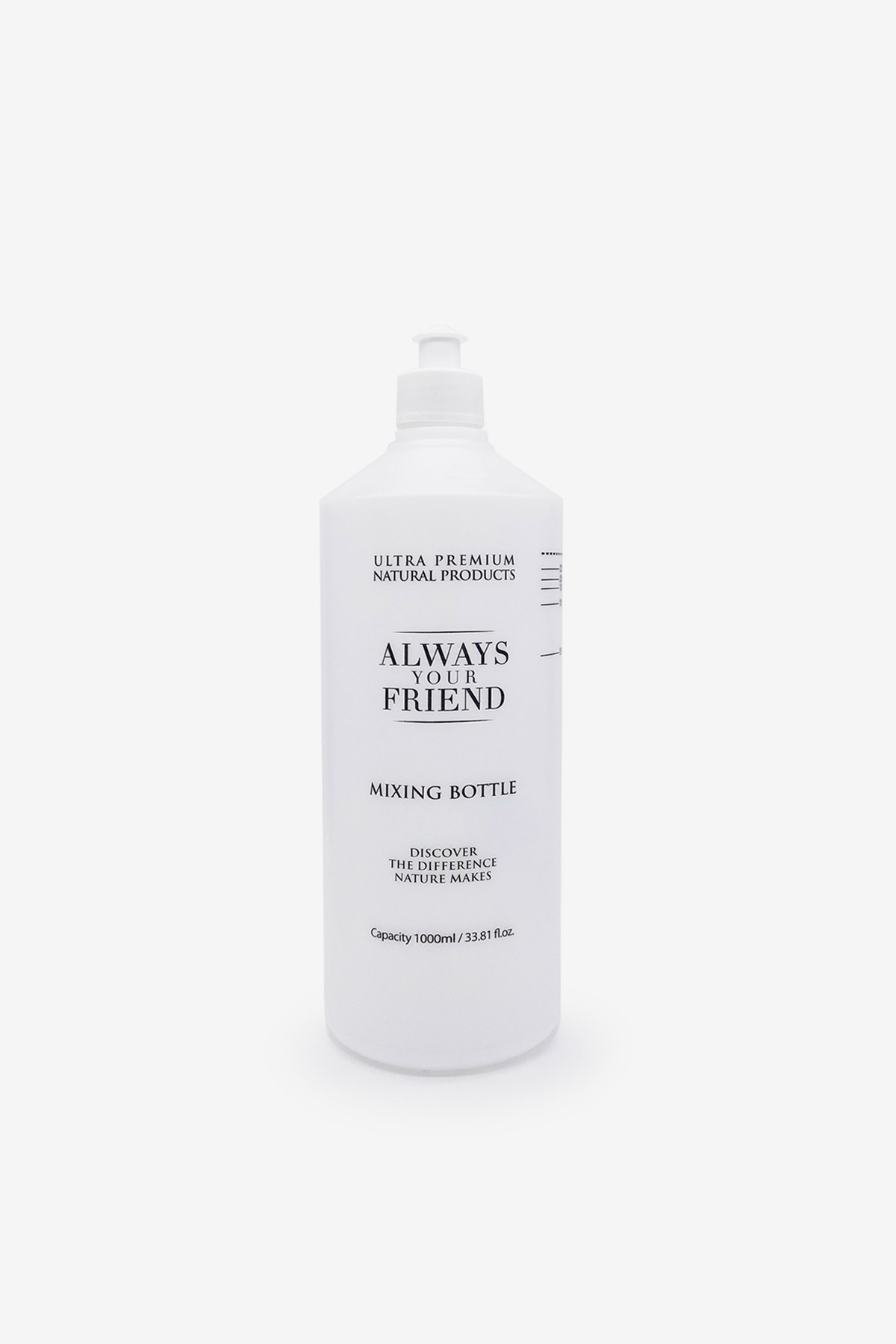 Always your friend mixing bottle makes it quick and easy to dilute and blend shampoos or other products. The bottle features ratio lines for 50:1, 40:1, 32:1, 20:1, 15:1, 10:1, and 5:1. Fill with water to the appropriate dilution level and add concentrate to the product filling line, shake well, and apply to the coat.