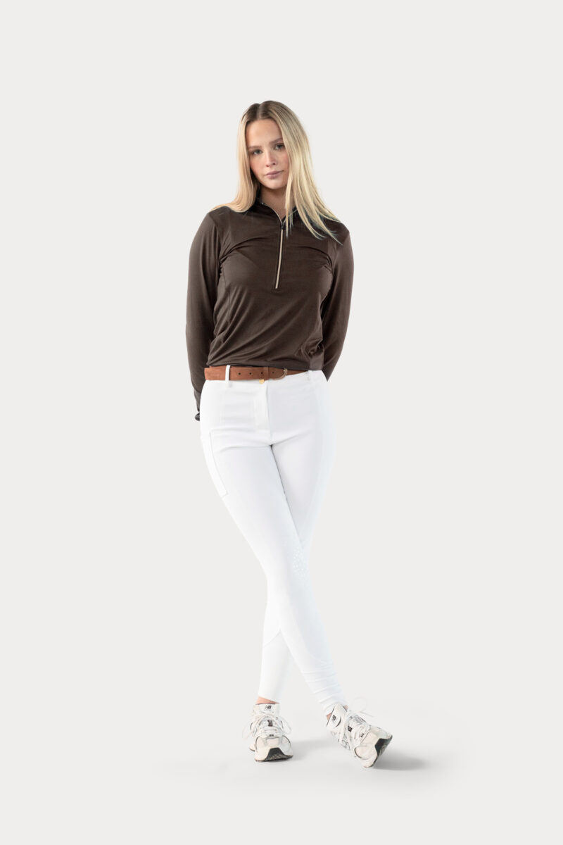 Made from a cutting-edge stretchy fabric with 4-way stretch technology, these breeches ensure unrestricted movement for optimal performance. The high waist design provides both support and a flattering fit, while the mobile pocket on the side lets you store your phone or snacks for your equine companion. The subtle logo details on the ankle, along with golden button details, add a touch of elegance to your riding ensemble.