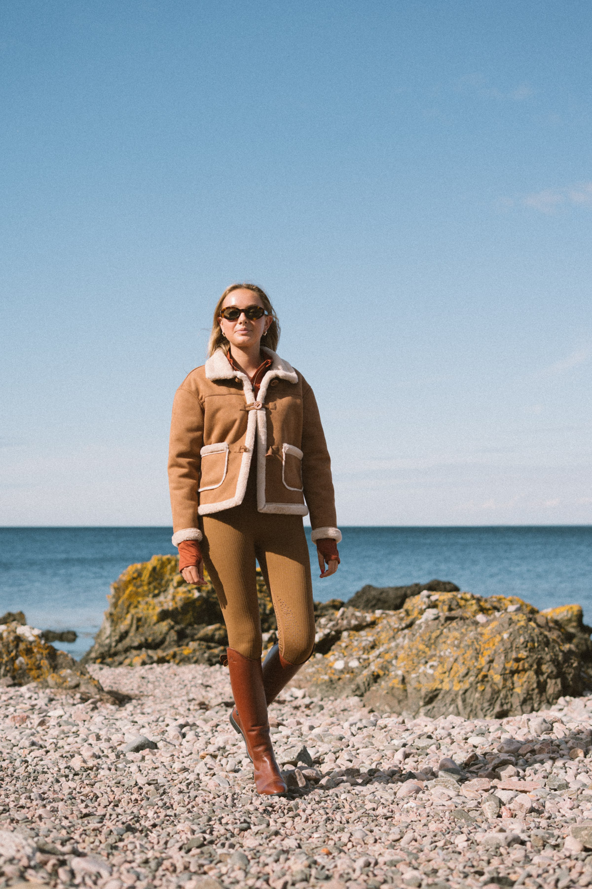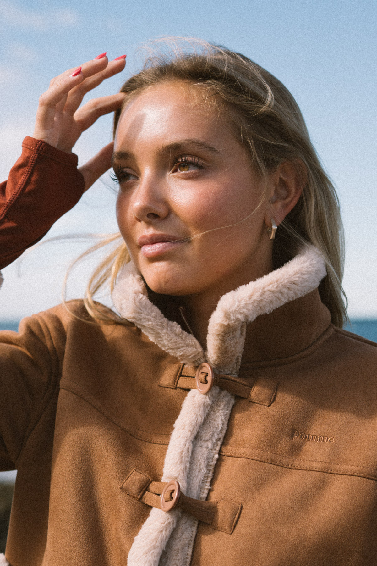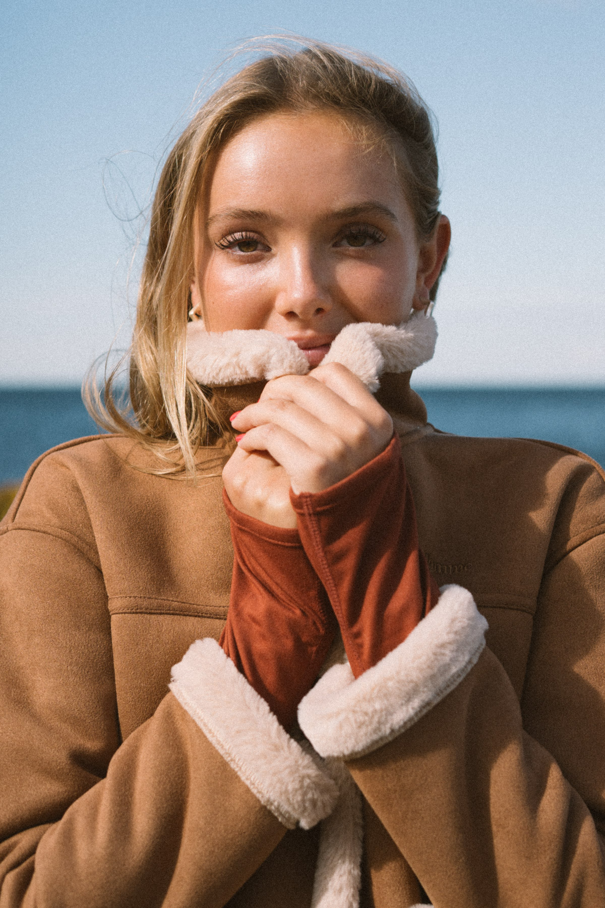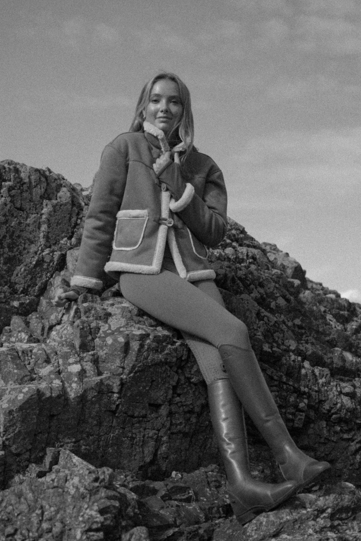 Crafted from supple mocha suede, the jacket is fully lined with plush shearling, providing exceptional insulation on crisp mornings and long winter rides. Thoughtfully finished with shearling along the collar, cuffs, and hem, it balances practicality with understated luxury. The traditional rope-and-knot closure adds a touch of equestrian heritage, while two front pockets keep your essentials close at hand. Mid-length in cut, it offers flattering proportions and easy layering over your riding or everyday outfits.