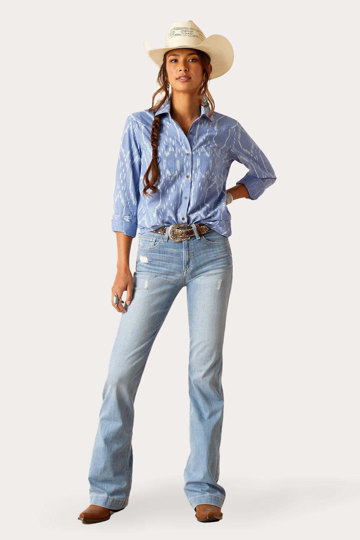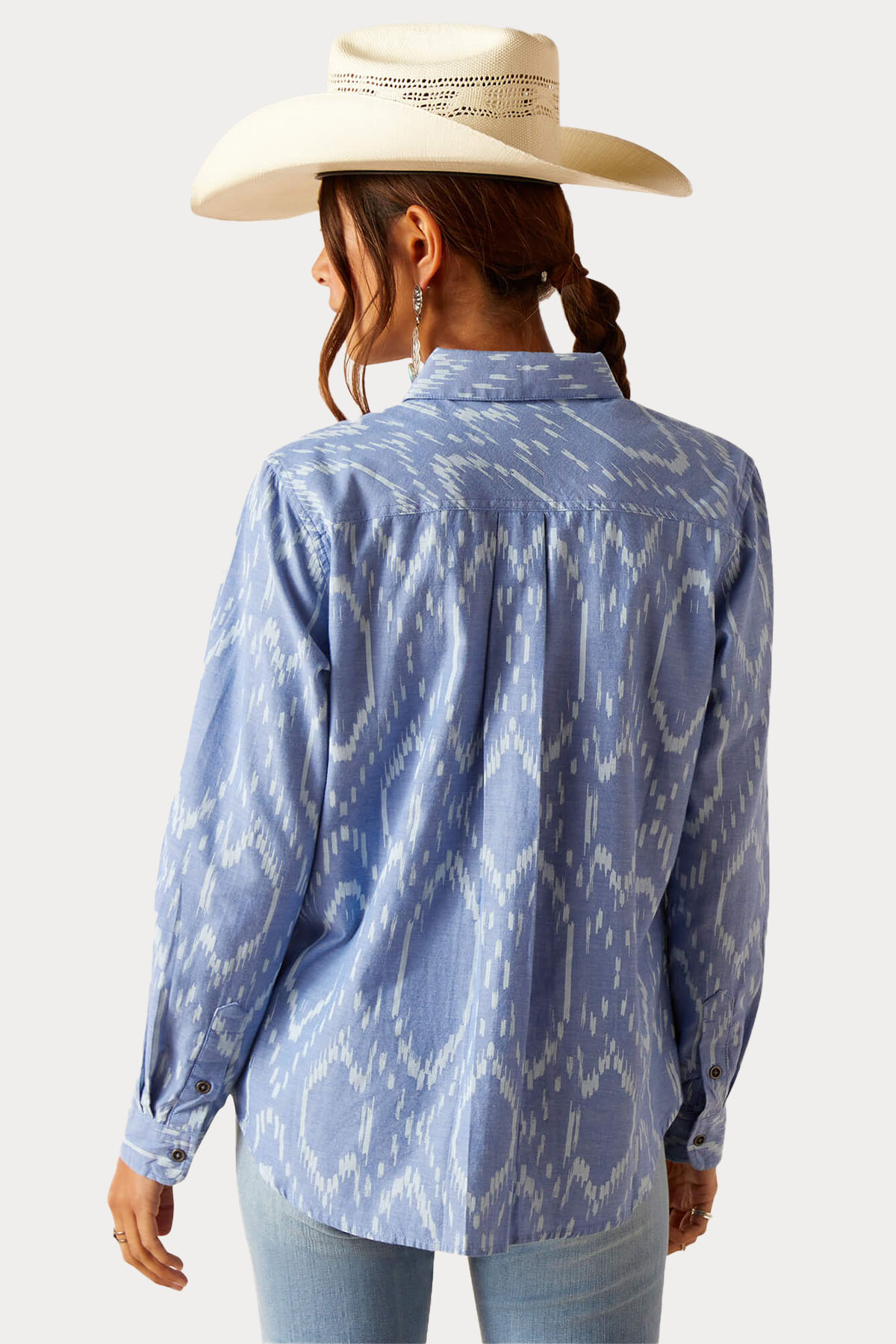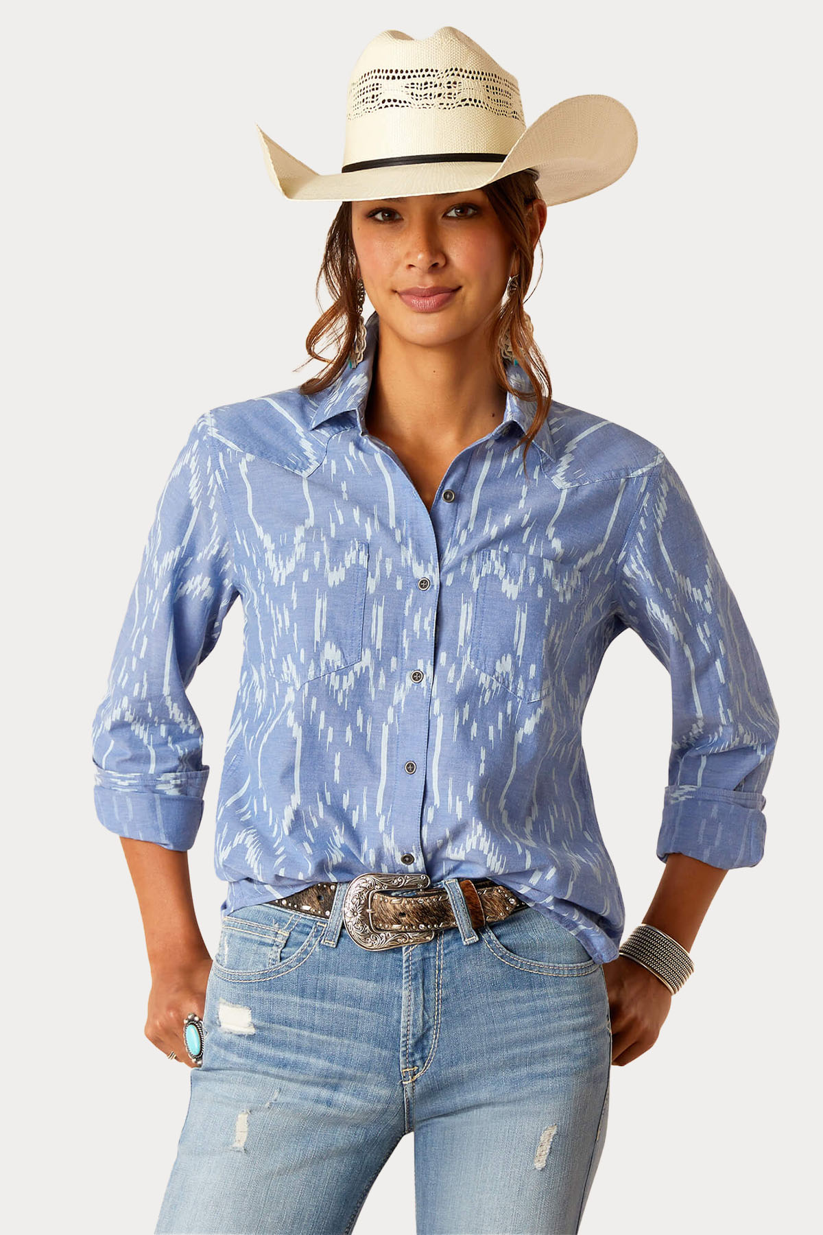 The Ariat Billie Jean Western Shirt is a versatile staple that effortlessly transitions from work to play. Crafted from super soft 100% cotton, this shirt offers exceptional comfort while providing a little extra warmth on cooler days. Its button-front closure and classic chest pockets add a timeless touch, making it perfect for layering over a plain tee or tucking into your favorite pair of jeans. Whether you’re heading to the barn or out with friends, the Blackhawk Ikat print brings a stylish edge to any outfit.