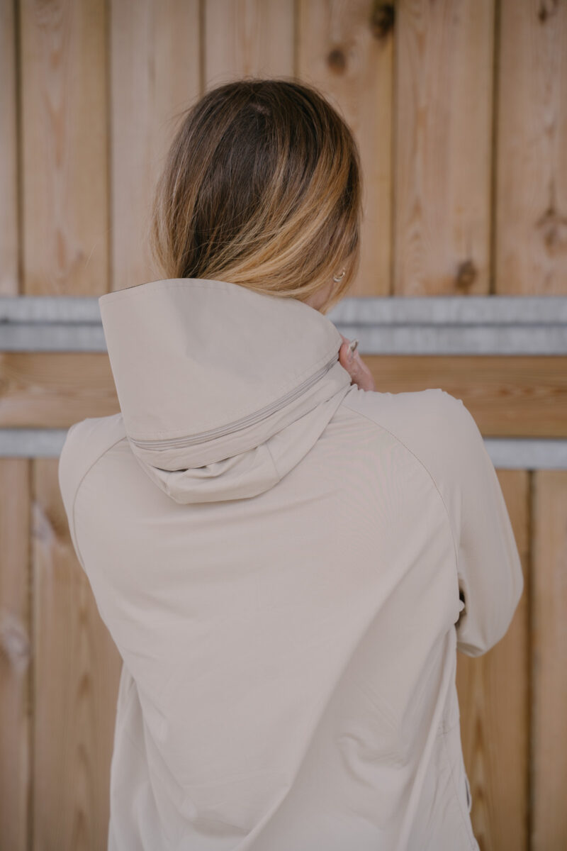 Made from a featherlight technical fabric (88% Polyamide, 12% Elastane), the Clara moves with you while keeping you cool under pressure. A high collar and adjustable hood provide extra coverage, and the removable visor on the hood offers a smart, versatile touch for varying weather conditions. Two zippered side pockets keep essentials secure, while a front zipper allows for easy layering and ventilation.