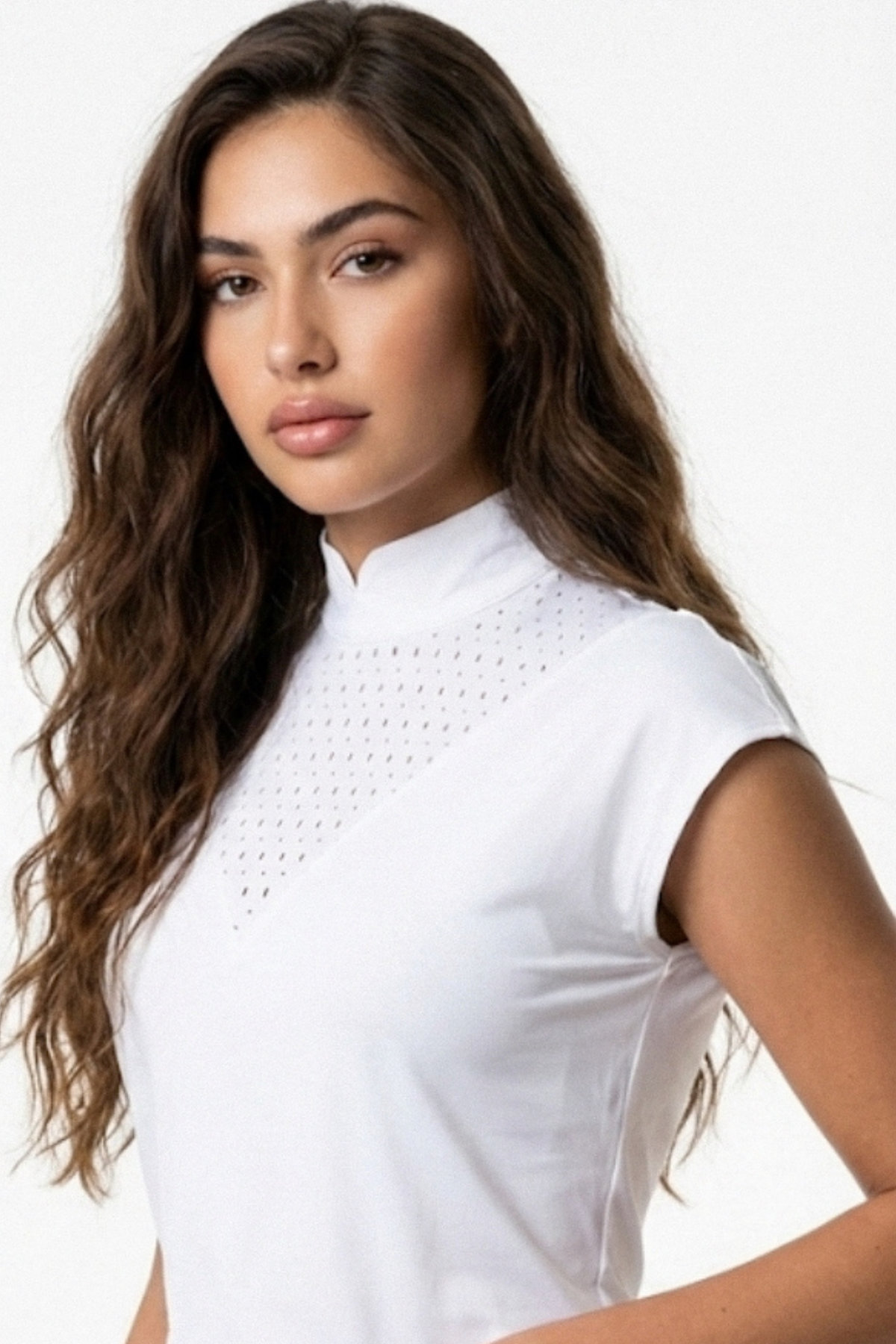 Featuring laser-cut detailing inspired by classic Broderie anglaise, the Dahlia top brings a touch of heritage style to a technical performance garment. With front and back ventilation panels and a sleek double collar stand, it offers both functionality and polish for serious riders. Whether you’re in the warm-up ring or mid-test, this top is built to support your ride with comfort and grace.