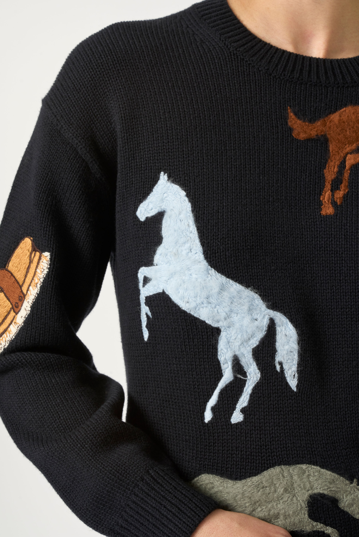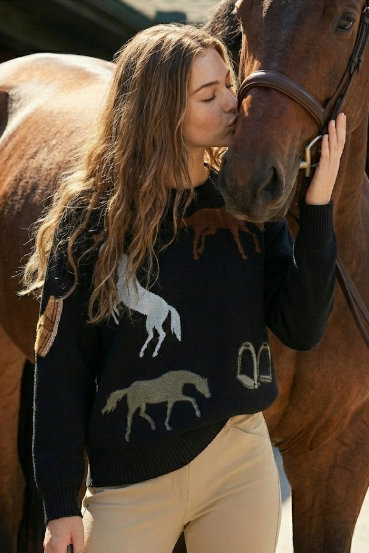 Crafted from a soft, cozy blend of merino wool and cotton, it provides lasting warmth without compromising breathability, perfect for chilly mornings at the barn or casual outings. The round, ribbed neckline and ribbed cuffs enhance comfort while maintaining a flattering oversized fit, offering freedom of movement for riders and horse lovers alike. Its stable-inspired pattern, crafted to mimic a hand-knitted feel, adds a unique artisanal touch that celebrates your connection to horses in every detail.