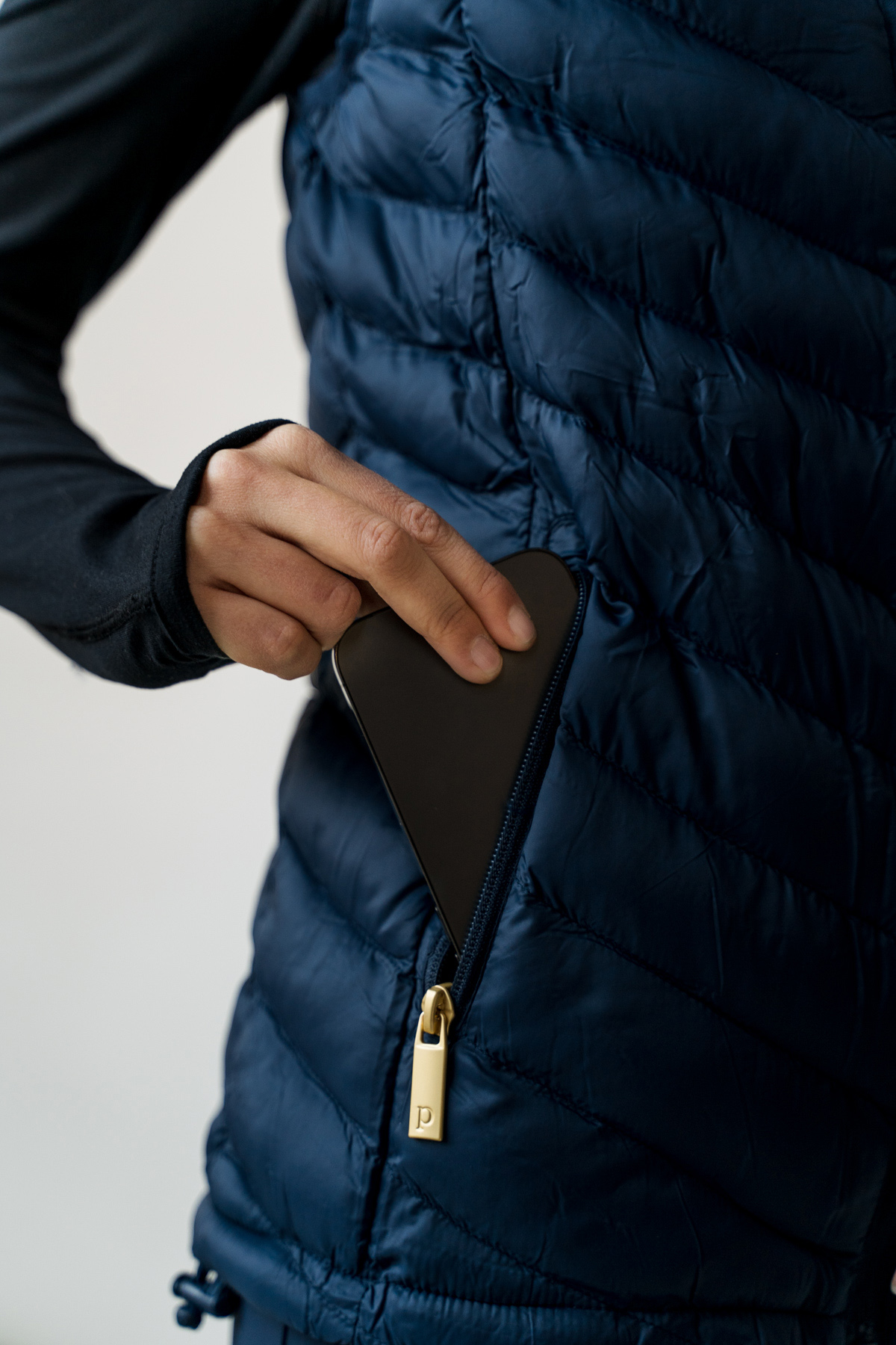 The vest is super flexible and lightweight so it can easily be transported in small spaces. The pockets fit your mobile phone and comes with zipper closure.