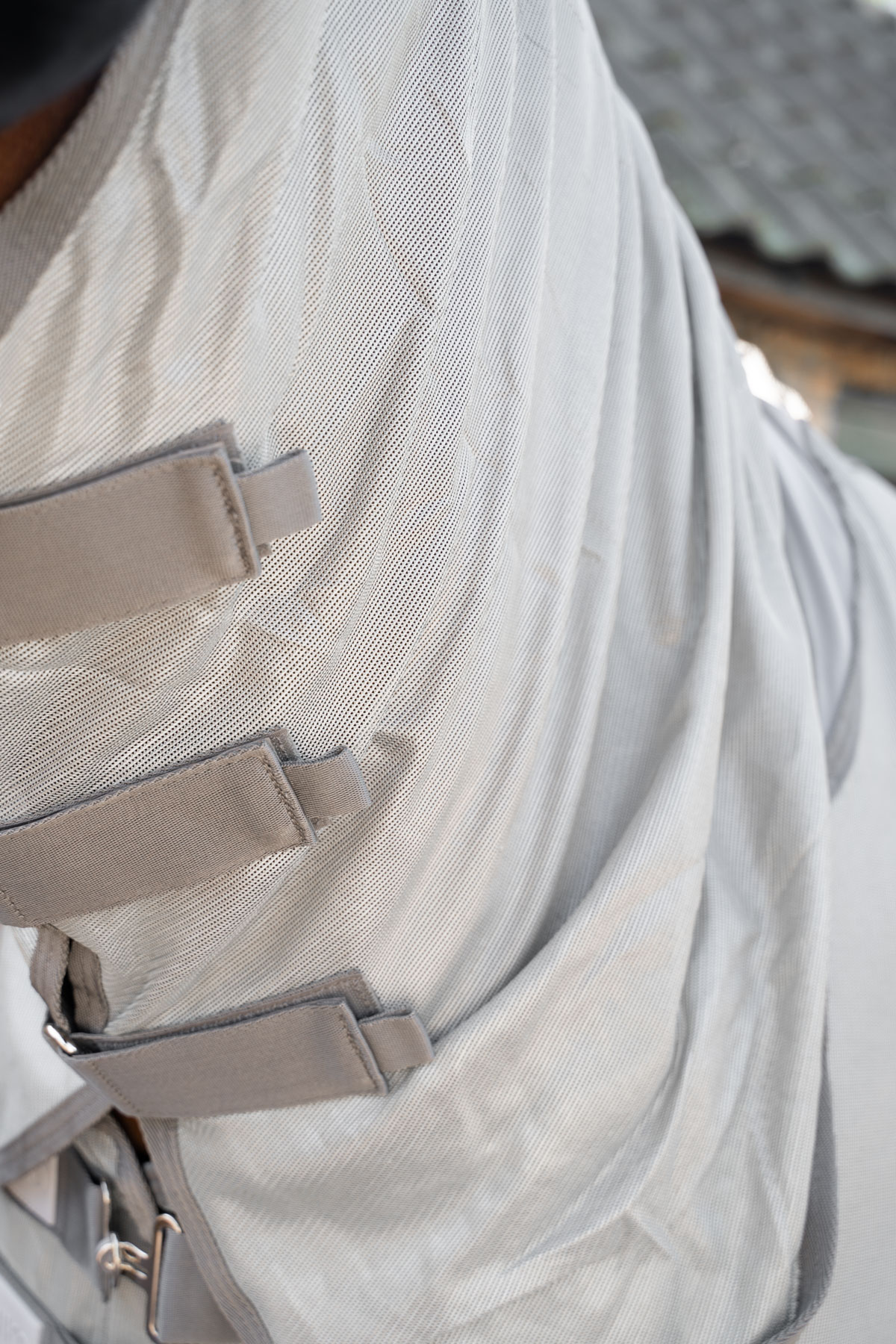 Vårt flugtäcke är tillverkat av tätt, strukturerat nättyg och stöter effektivt bort de flesta insekter samtidigt som det förblir hållbart för otaliga somrars användning. Det andningsbara nätet möjliggör optimal luftcirkulation, vilket håller din häst sval och bekväm även på de varmaste dagarna. Dessutom, med slätt polyesterfoder i viktiga områden som man, bröst och svans, är skav och gnidning ett minne blott.