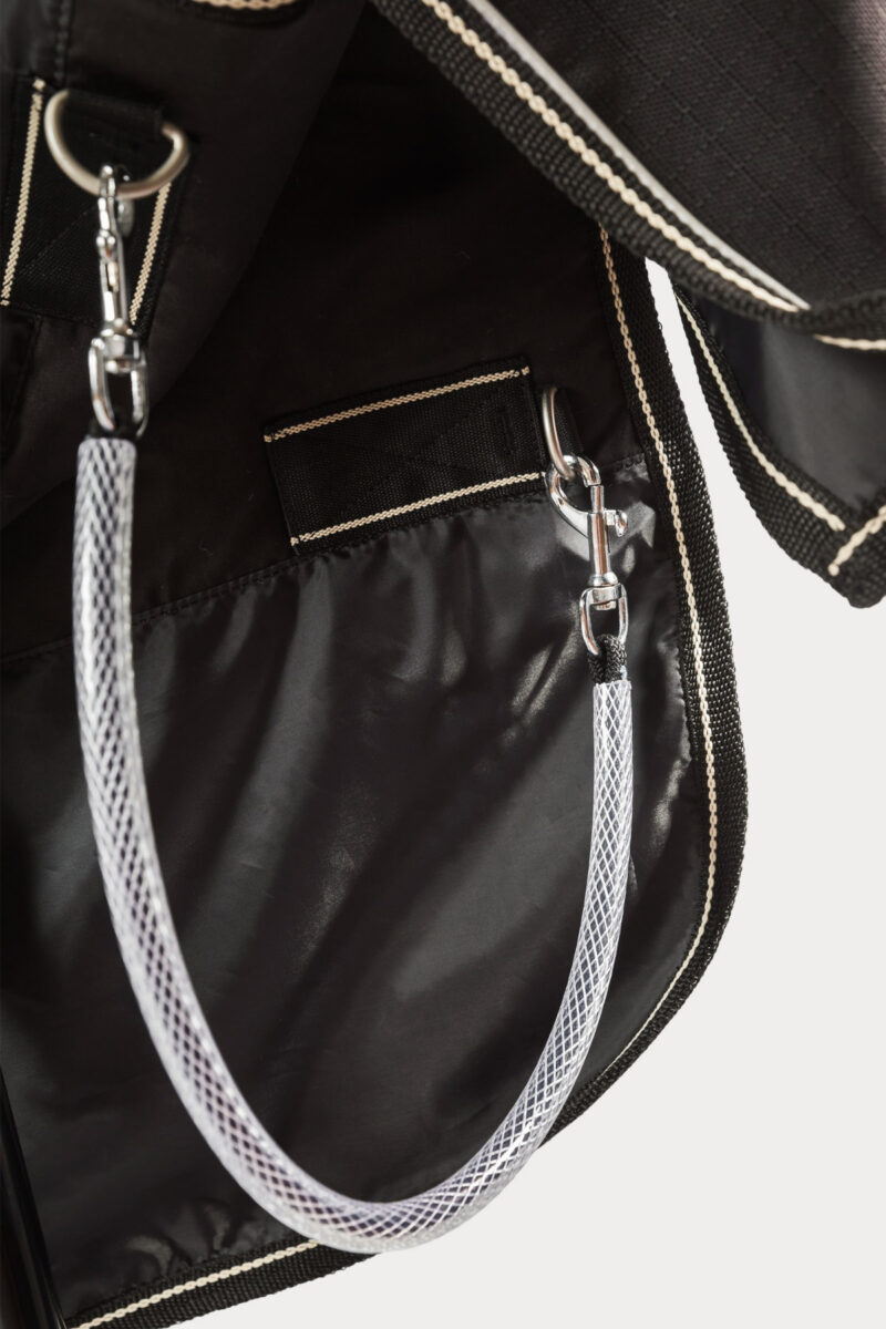 “Brianna” is designed with a half neck and a large tail flap for extra protection against rain and windy conditions. Glossy lining over the shoulders, mane, and tail prevents chafing and helps maintain your horse’s coat. The tail strap features a plastic coating for easy cleaning.